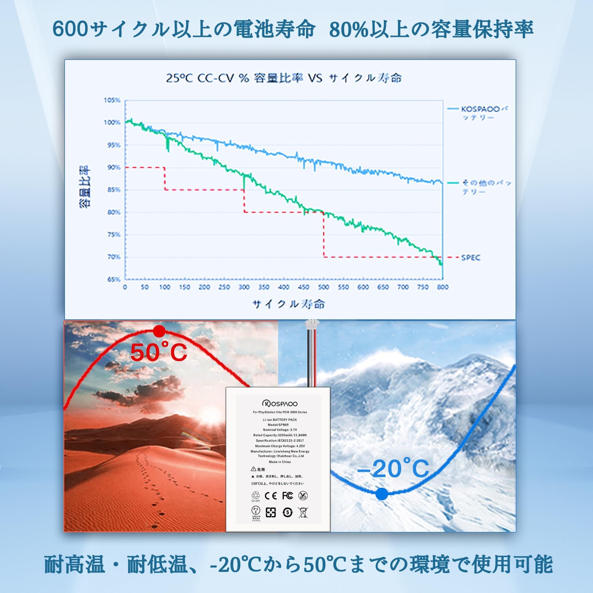 【3200mAh大容量】当店のPS Vitaバッテリー互換 はサイズをそのままにしたまま、応用グラフェン材料製造、電池容量は44.8%増加し(元の容量2210mAhより990mAh多い)、低温と高温に対する耐性が向上し、充電サイクル寿命は600~800回に達する、適用PCH-2000 バッテリー大容量。
