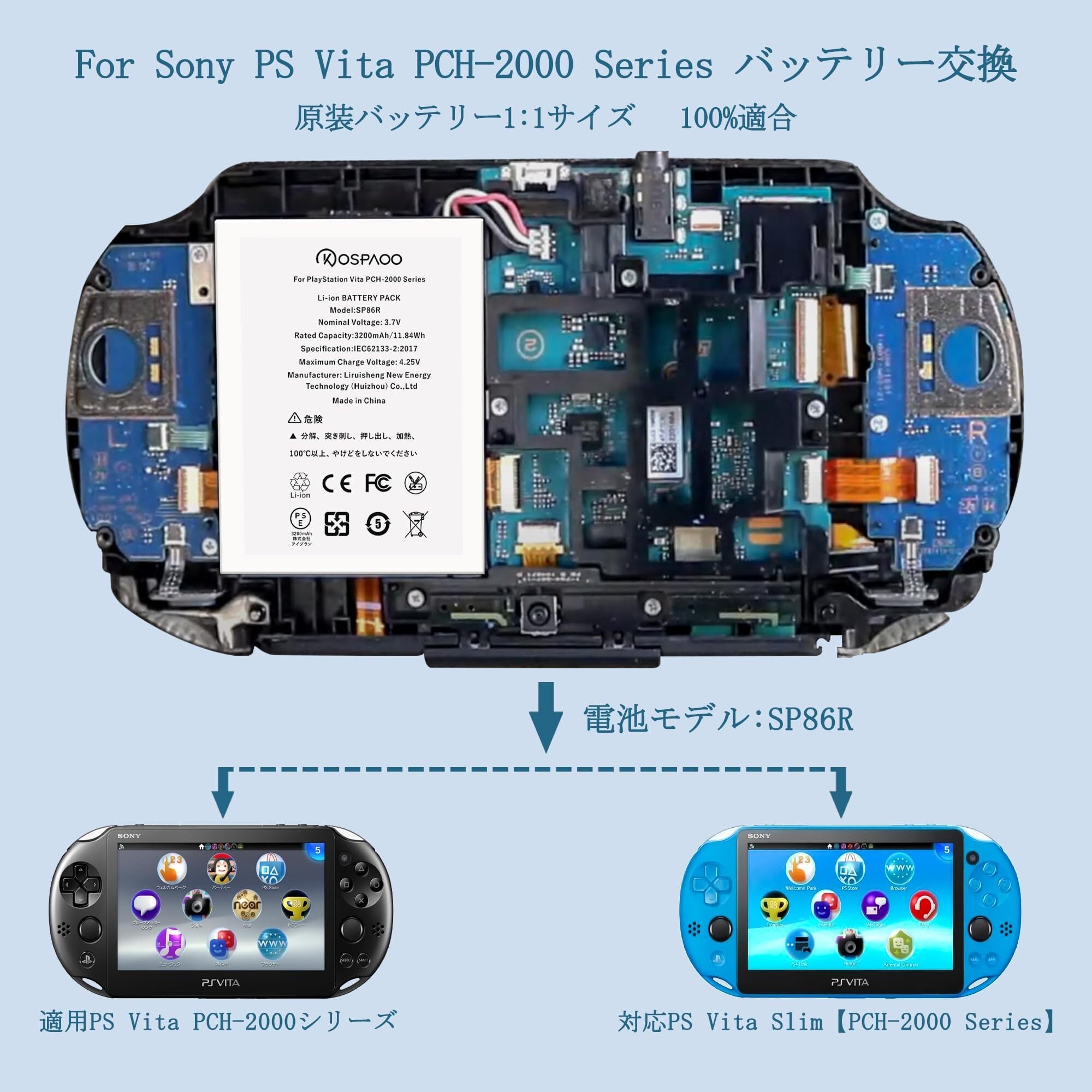 for Sony PlayStation Vita PCH-2000 バッテリー交換 大容量3200mAh 3.7V 増量44.8% SP86R電池 PSE認証 対応PlayStation Vita Slim/PCH-2000電池 互換修理用 高温・低温耐性 600~800サイクル寿命 適用PlayStation Vita 2000 battery【No Tool】