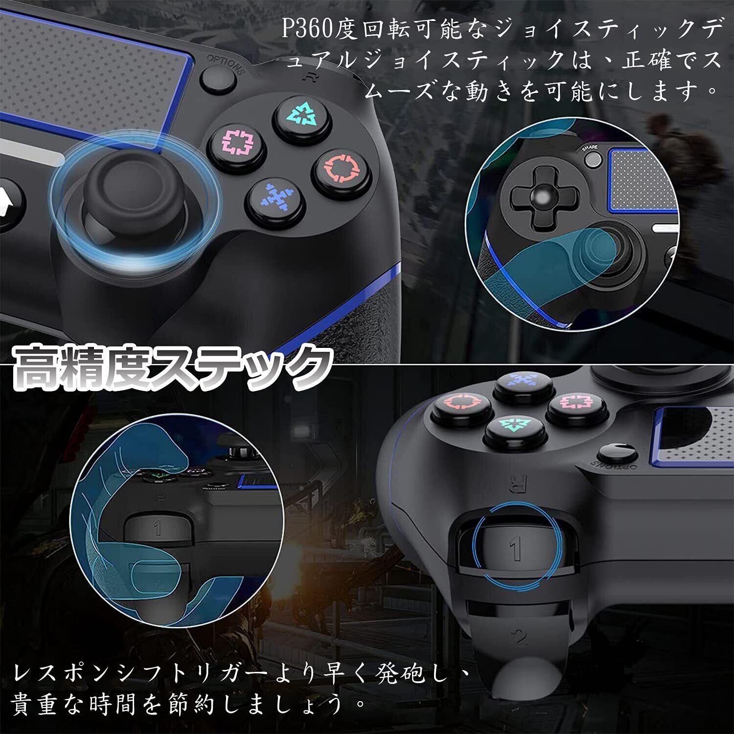 【2025新登場 P4コントローラー・広範囲のシステム互換性】本ワイヤレスコントローラーは斬新なデザインとユニークな外観を持っています。USB端子に接続するだけで、有線コントローラーになれ手軽に使用でき、そして、最新のチップデザインが搭載され、最新バージョンのPS4システムソフトウェアと完全に適合します。P4ワイヤレスコントローラーはP4、P4 Pro、P4 Slim、P3、PC(Windows7/8/10)、スマートフォンなど多数のゲームプラットフォームと完全に互換性があります。コントローラー背面にはリセットキーがあり押すと、充電できない問題などが解決します。マルチプレイヤーゲームが実現でき、最大4台 P4 コントローラーを接続可能。注意:最新のP4システムゲームバージョンが動作しますが、p5ゲーム機でしかP4ゲームをプレイできません。