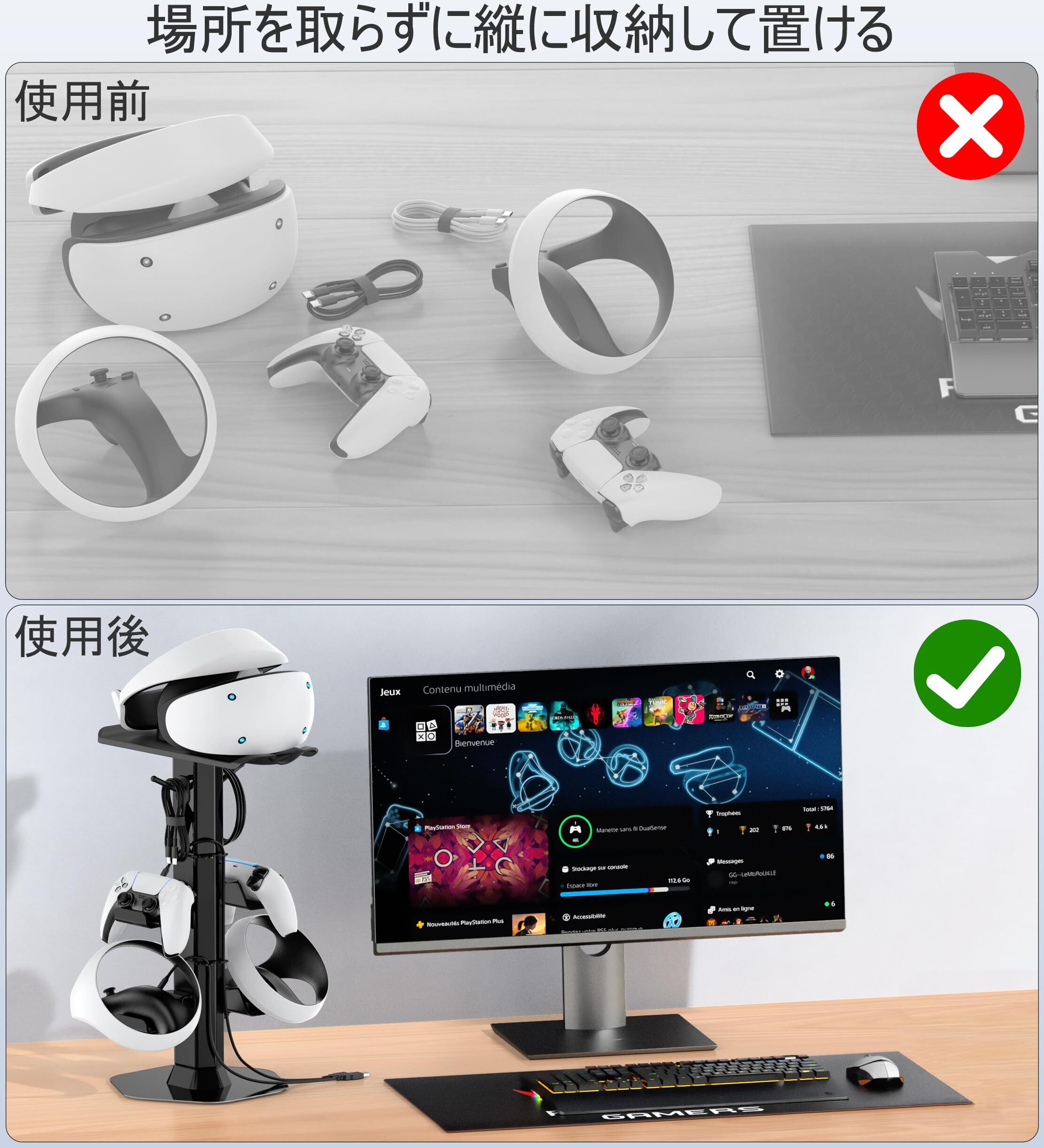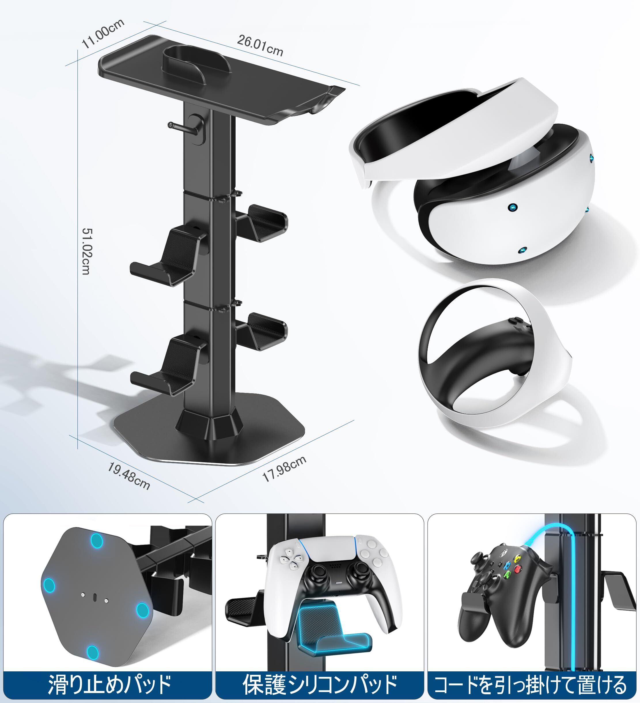 「このスタンドは、様々なコントローラーやヘッドセットに幅広く対応しています。PSVR2用にも最適な設計となっており、日々の使用に非常に便利です。すぐに取り入れて、あなたのゲーム体験を向上させましょう!」