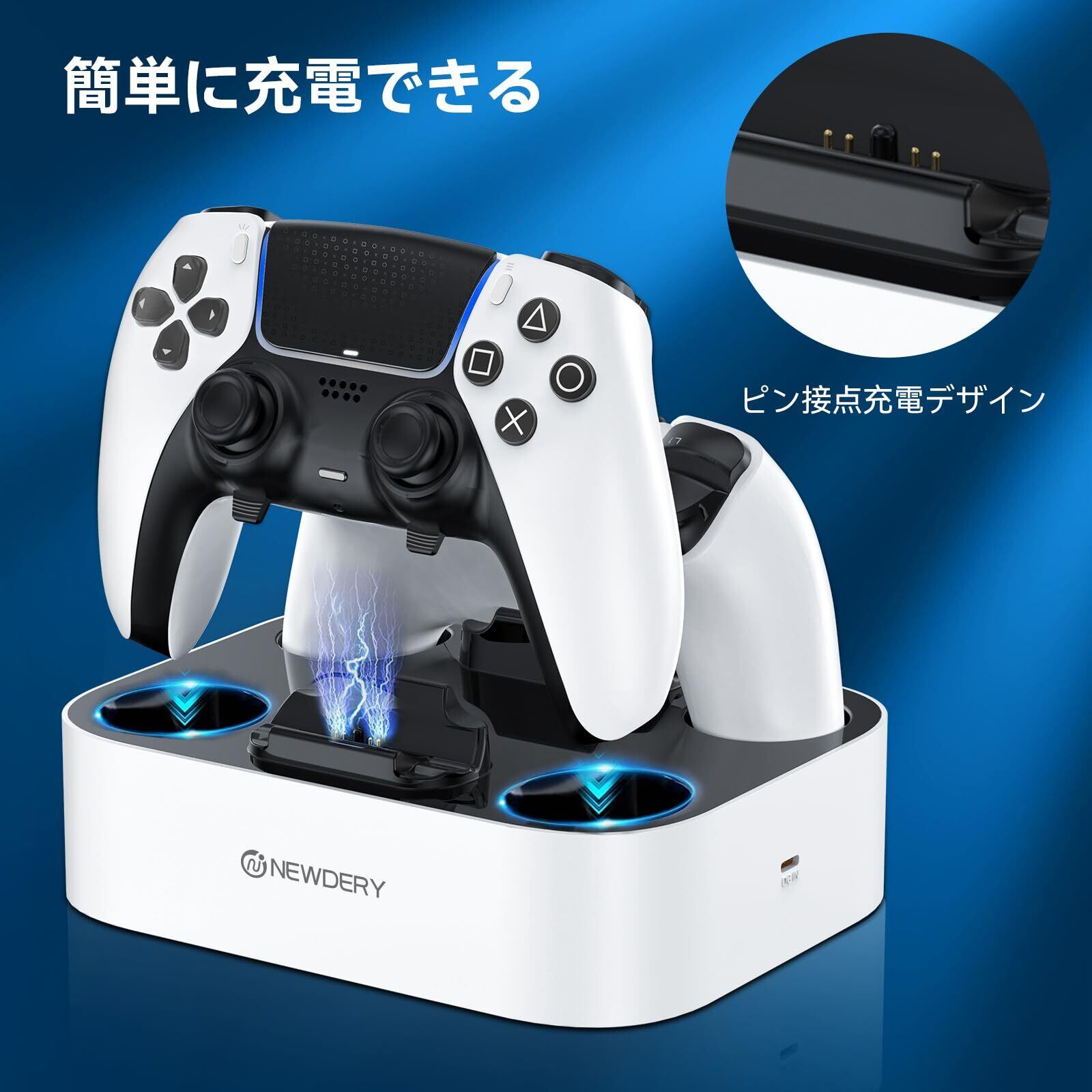 NEWDERY PS5 コントローラー 充電スタンド 急速充電 2台同時充電可能 置くだけ充電可能 過充電防止 USB-Cケーブル付属 LED指示ランプ付き ホワイト
