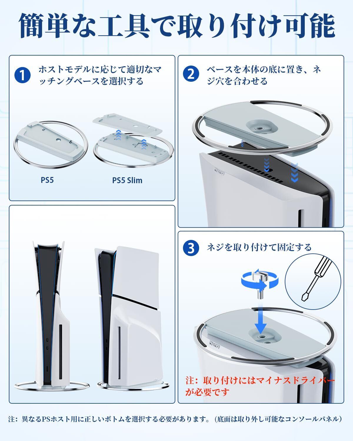 【P5 Pro/P5/P5スリム専用スタンド 】:底面には滑り止めのシリコンリング、本体固定用のネジが付属。 このP5スリム用スタンドは普通のプラスチック製スタンドを超え、場所を取らないだけでなく、P5 Pro/P5スリムとP5コンソールをより安定した筐体にし、不慮の衝突や滑りを心配する必要がありません。