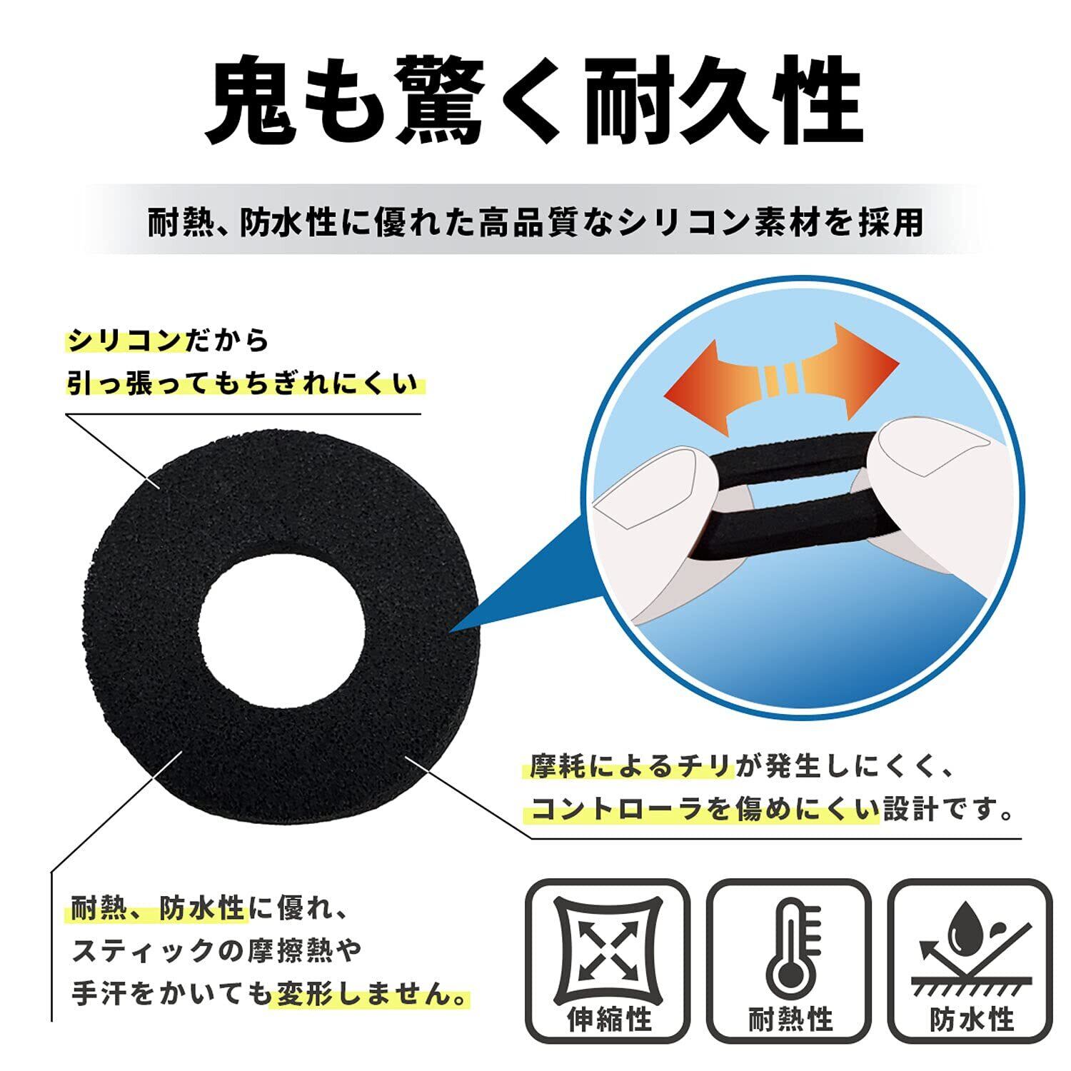 「すべてのリングは日本国内で製造された高品質なシリコンを使用しています。耐久性が高く、長時間の使用でもしっかりとしたコンディションを保ちます。高品質の素材は、コントローラーの操作感を損なうことなく、むしろ向上させること間違いなしです。」