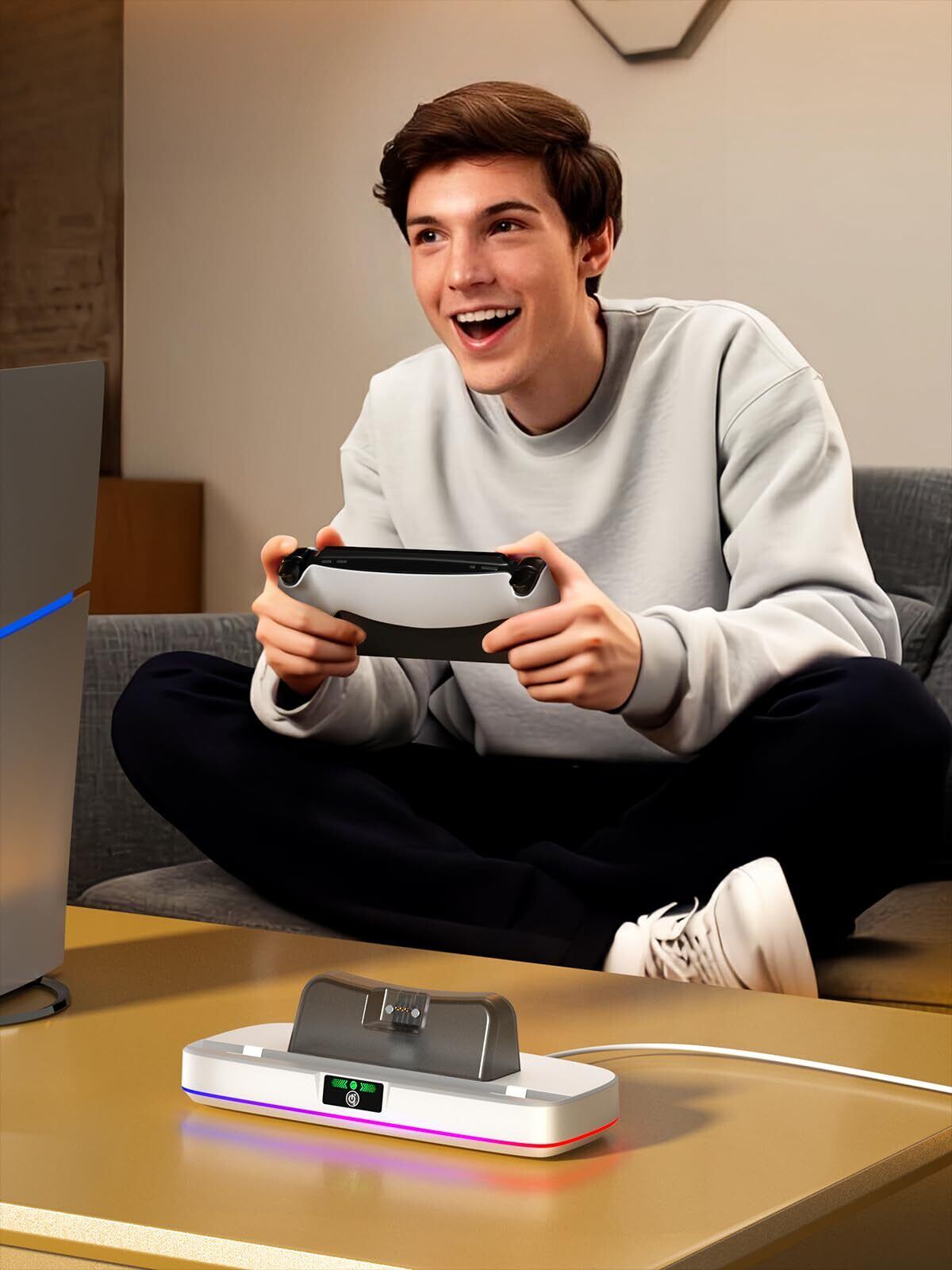 【RGBライト& LED表示ライプ付き】PS5 PS Portal 充電器が搭載したRGBライトは、スイッチボタンを押すだけで異なるRGBライトモードを切り替えて、6 つの単色ライトと 3つの呼吸ライトが含まれて、クールなエフェクトでゲーム体験を向上できます。LED表示ライプも付いて、青いライトは充電中を示し、緑のライトはフル充電/スタンバイ中を示します。PS5 PS ポータルの充電状況を一目でわかります。