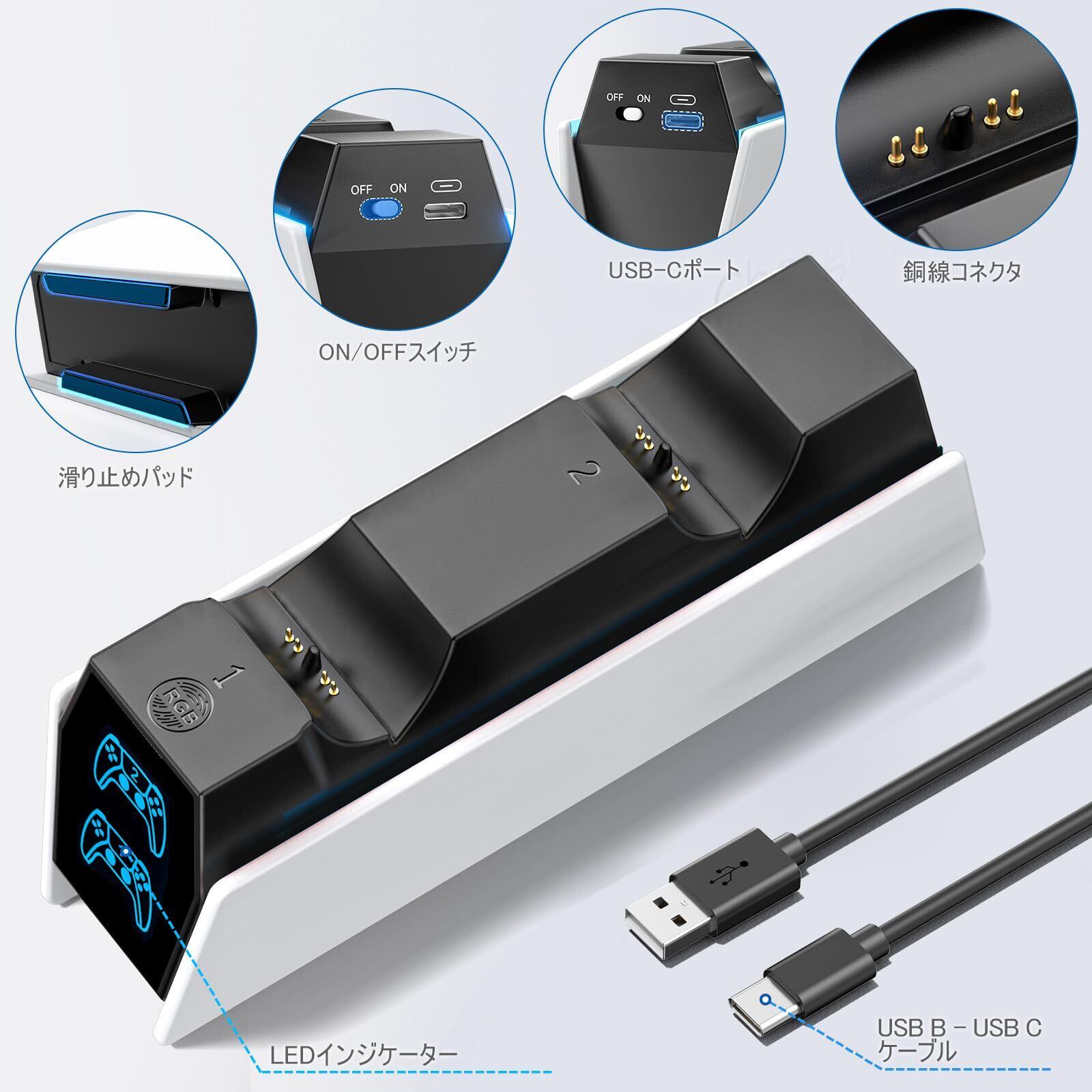 【LEDインジケーター】PS5コントローラー充電器は充電が完了したことをランプの色で知らせてくれるLEDランプを備え、充電中と充電完了を一目で分かりやすいです。充電中は赤色ライト点灯し、充電完了は青色ライト点灯します。