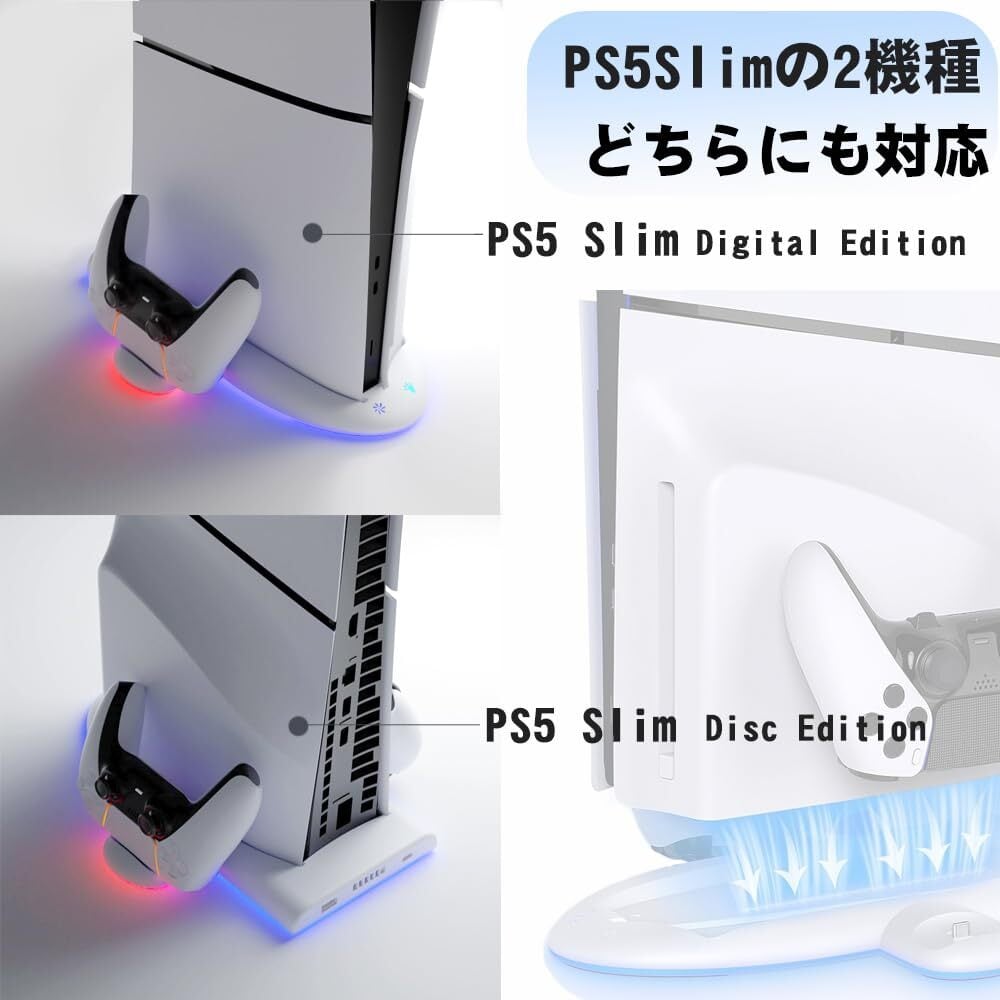 PS5 Slim用 スタンド コントローラー充電器 冷却ファン付き RGBライト搭載 縦置き横置き対応 ディスク/デジタル版兼用 PS5周辺機器 2in1充電ドック