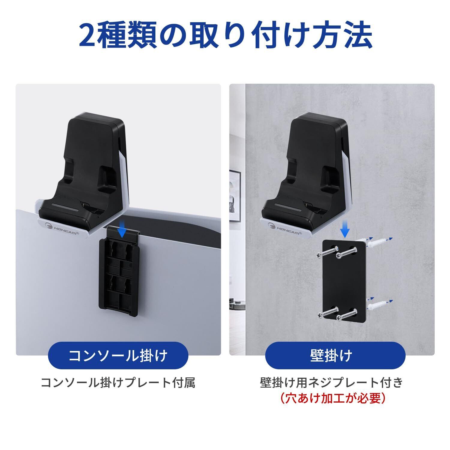 2種類の設置オプション:ドリルを使った壁面取付(付属のネジ・アンカー付き)か、PS5本体へのフック掛けを選択可能。耐荷重設計で安定した設置を実現します。