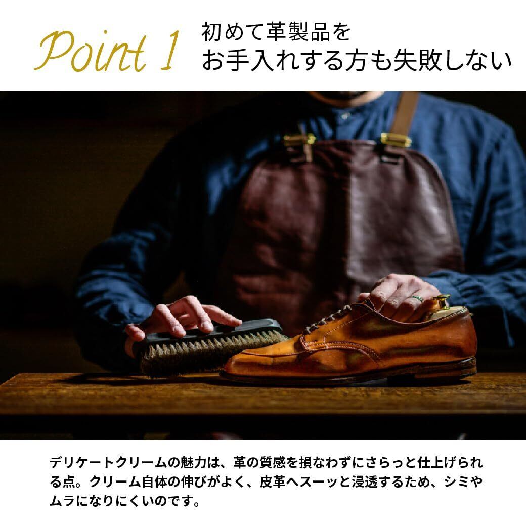 「このクリームは乳化性のため、革に深く浸透しやすく、シミになりにくい特性があります。ヌメ革にも安心して使用できるため、お手入れが簡単で、革製品の長持ちを実現します。日常のメンテナンスを手軽に行えるこの製品は、革好きには欠かせません!」