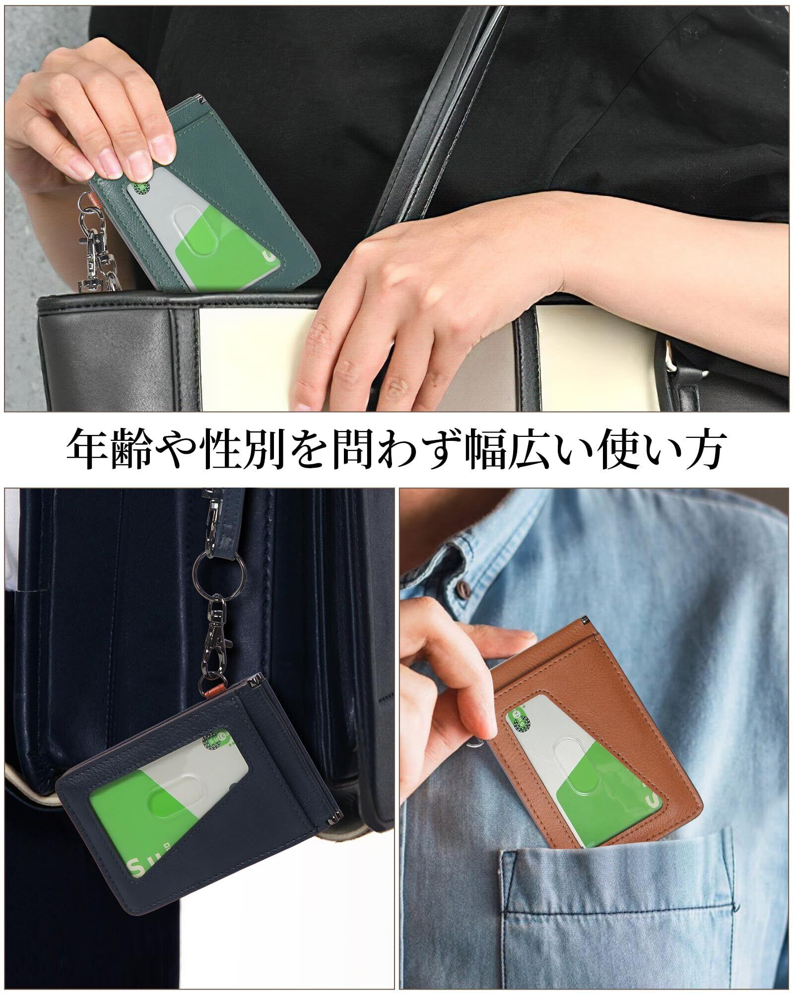 「グリーンカラーが際立つ『LuoLuo 定期入れ』は、ビジネスシーンだけでなく、カジュアルなスタイルにもマッチします。普段使いから特別な日のオシャレまで幅広く活躍するアイテムです。」
