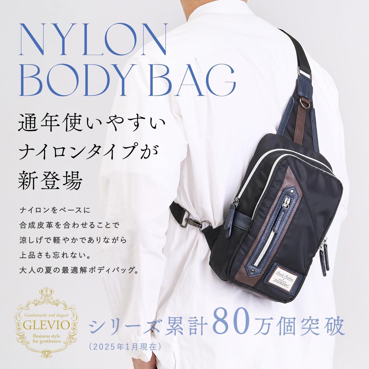 【軽快さと品格を兼ね備えた大人のナイロンバッグ】 シリーズ累計販売数80万個(2025年1月現在)を突破したGLEVIOが提案する、大人の休日にふさわしいナイロン製ボディバッグ。高密度に織り込まれたナイロン生地は、軽量でありながら高い耐久性と撥水性を誇ります。レザーのような重厚感よりも「軽さ」と「動きやすさ」を重視したい方や、旅行・アウトドアなどアクティブなシーンでの使用に最適です。安っぽく見えないマットな質感が、カジュアルな装いを洗練された印象に仕上げます。