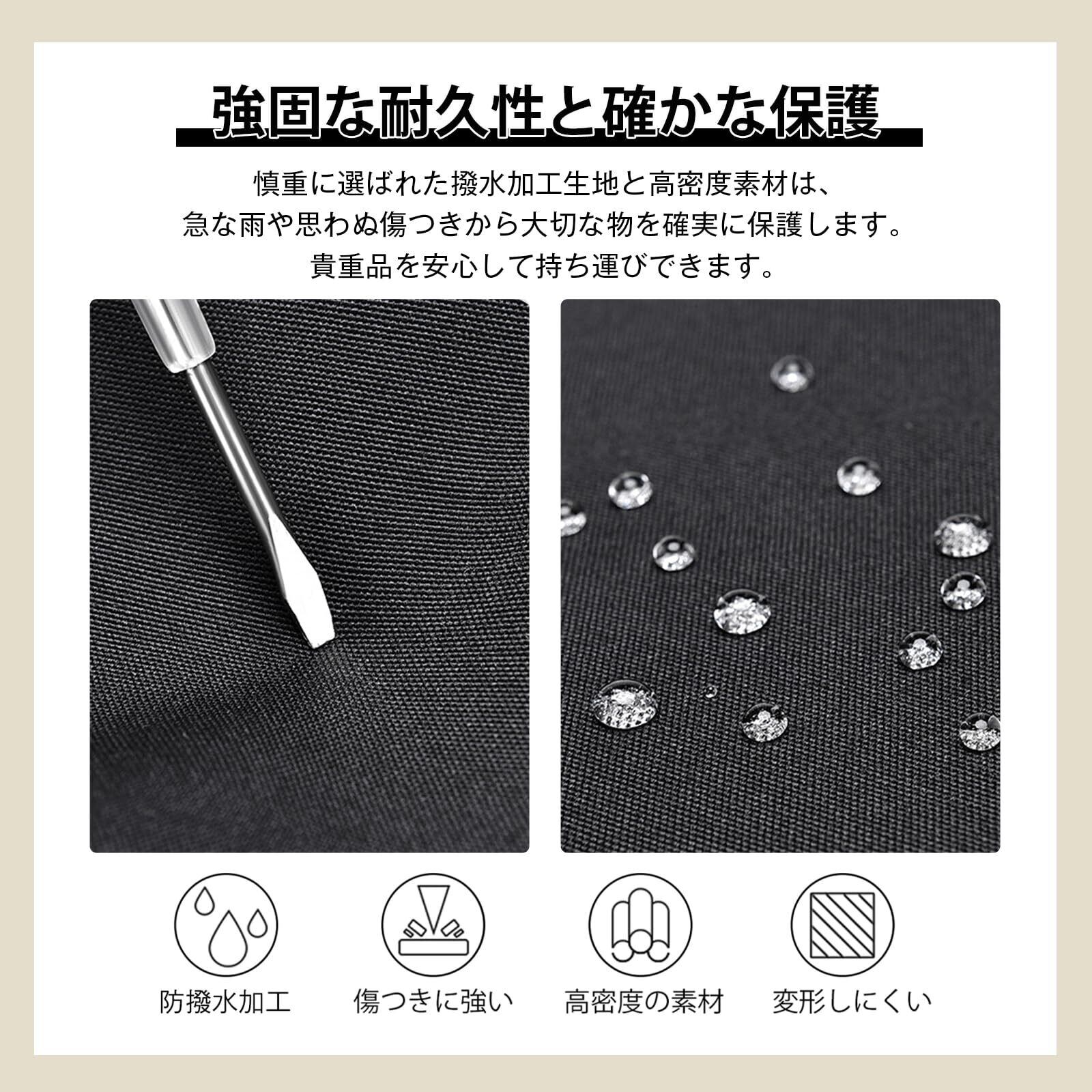 「高品質な防水素材を使用しているため、急な雨にも安心です。バッグ内部への水の侵入を防ぎ、大切な書類やデバイスを安心して持ち運ぶことができます。また、耐久性にも優れ、長くお使いいただけるアイテムです。」