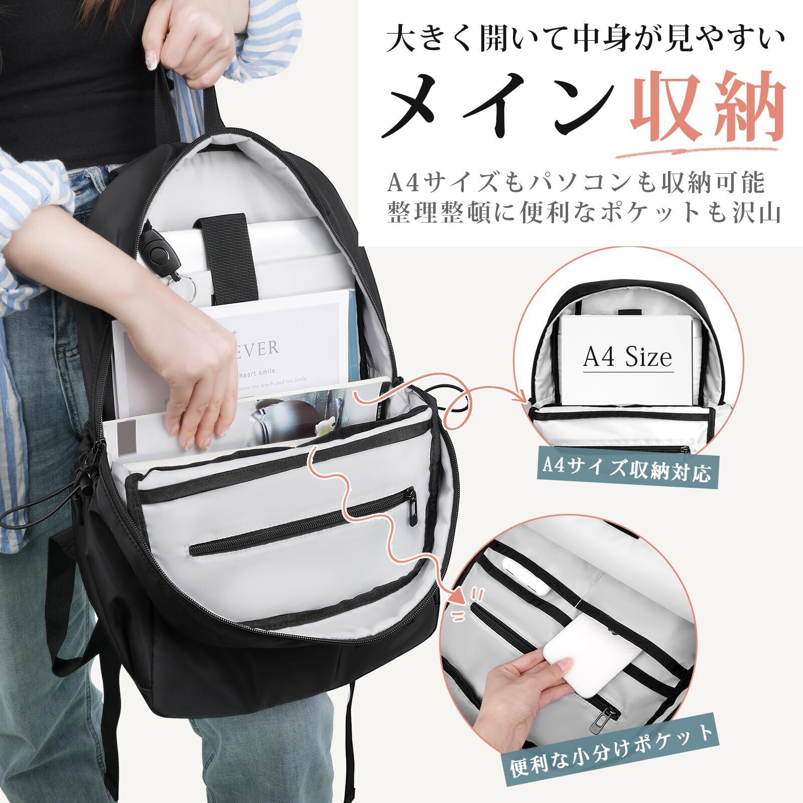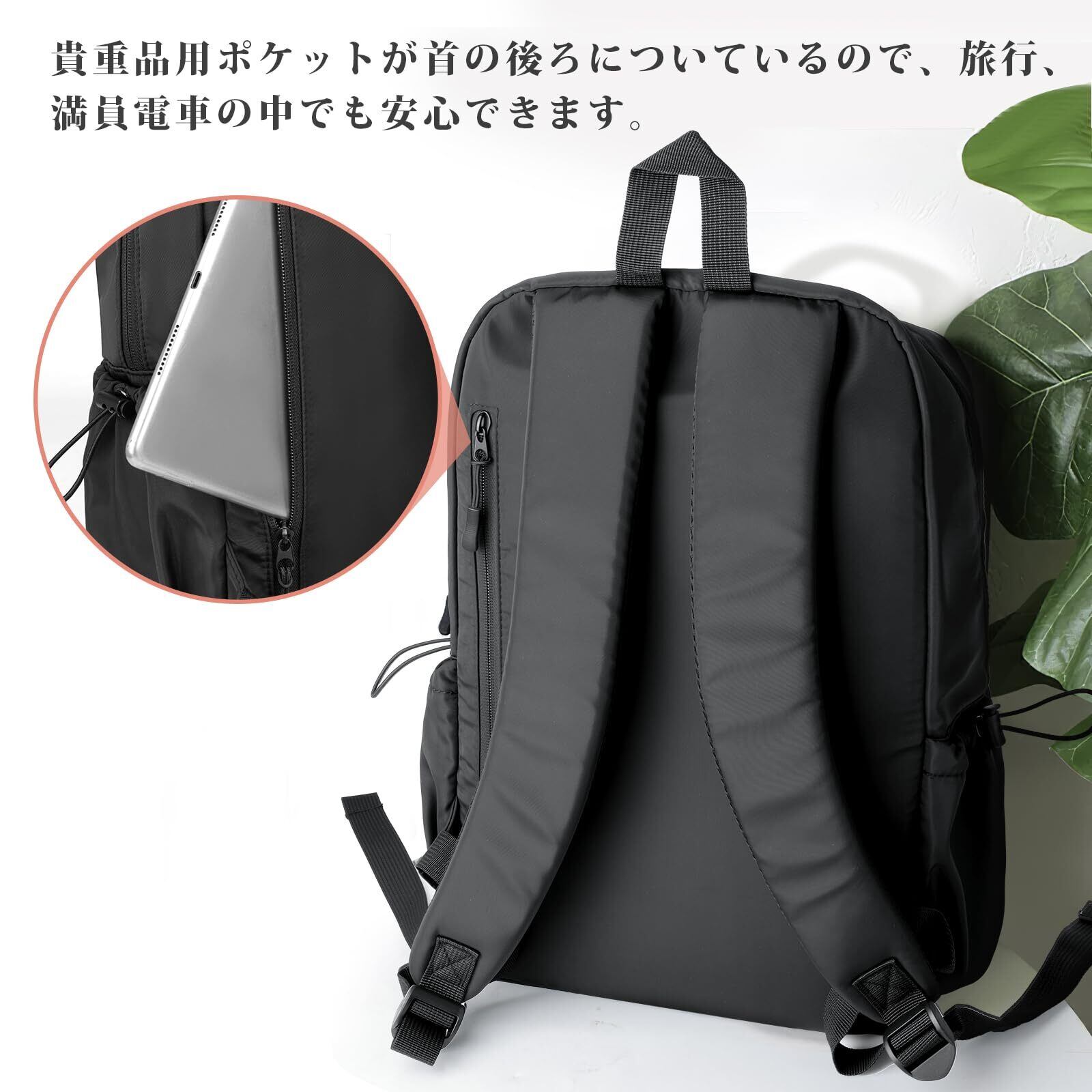 「リュック本体には盗難防止の機能が備わっており、貴重品や大切な荷物を安全に保ちます。通勤通学時や旅行先での安心感を追求した設計で、ストレスフリーなお出かけをサポートします。」