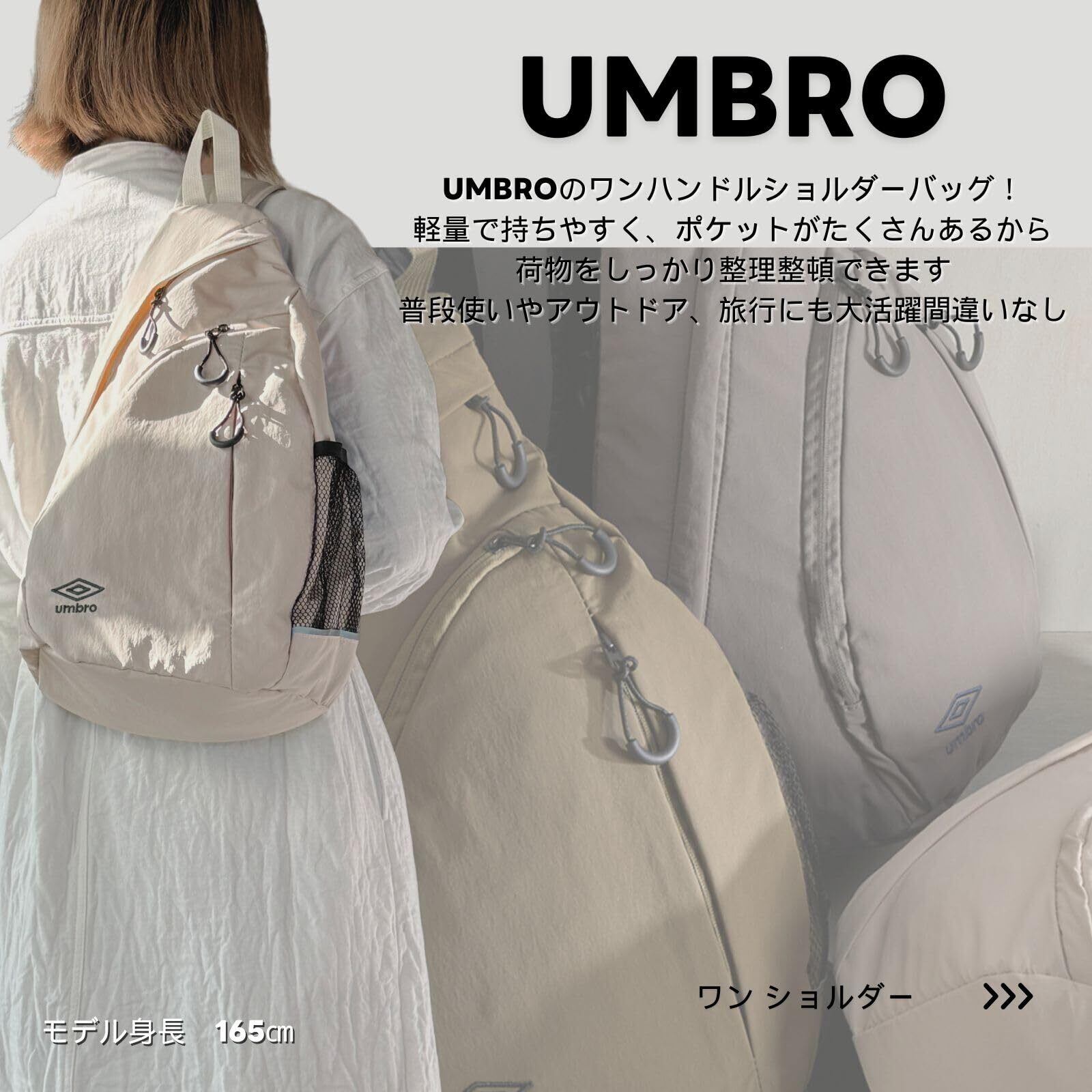 「『アンブロ ボディバッグ ワン ショルダー』は、軽量ナイロン素材を用いたデイパック。日常の街歩きや旅行に最適なサイズ感で、必要なアイテムを効率よく収納できます。斜め掛けできるストラップにより、移動中もストレスフリーで快適です!」