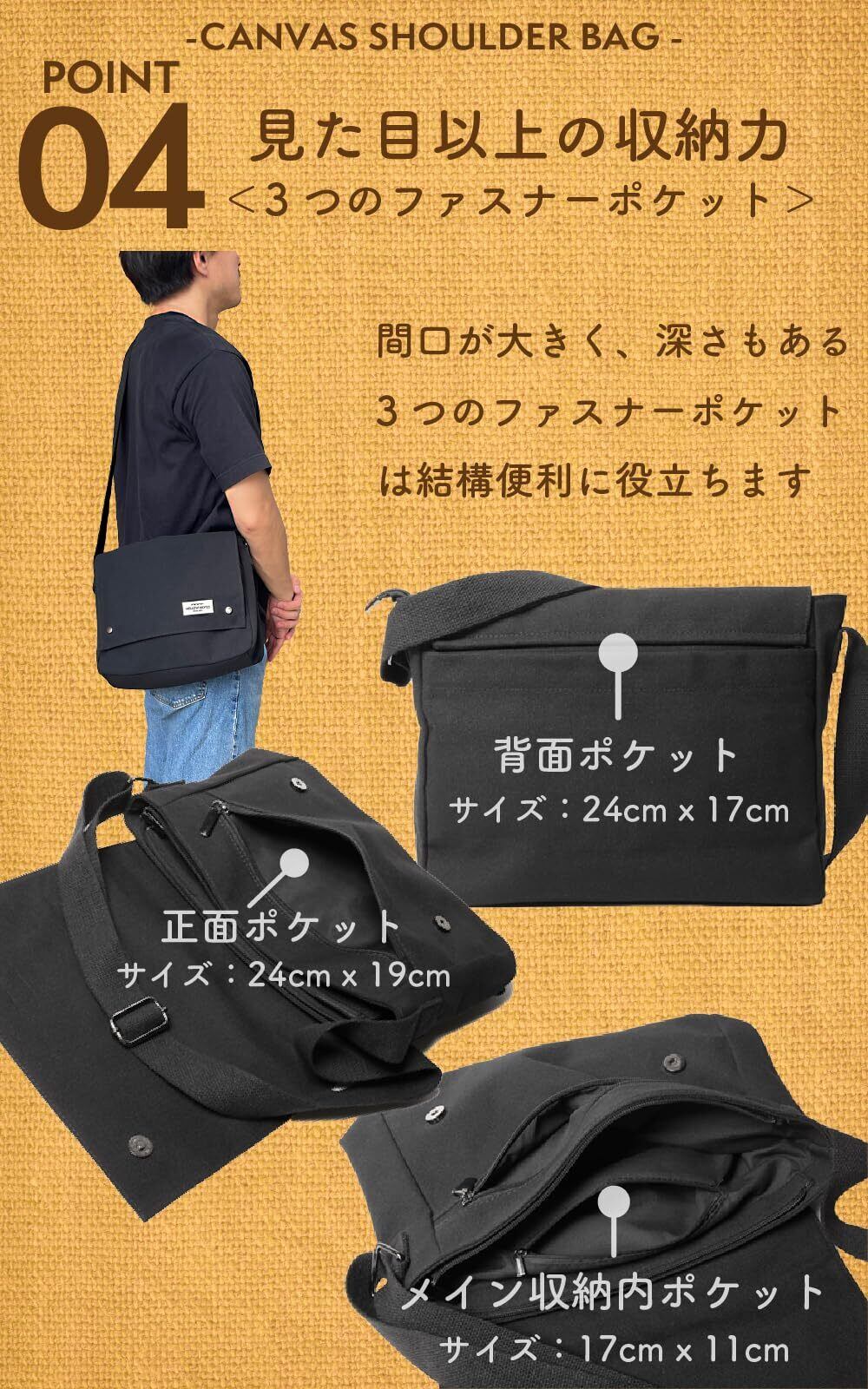 「高品質の帆布とキャンバス素材を使用しており、耐久性に優れた仕上がりです。日常の使用に適した軽量設計で、長時間の使用でも疲れにくく、快適な持ち運びを実現します。ショルダーストラップも調節可能で、あなたにぴったりのフィット感を提供します。」
