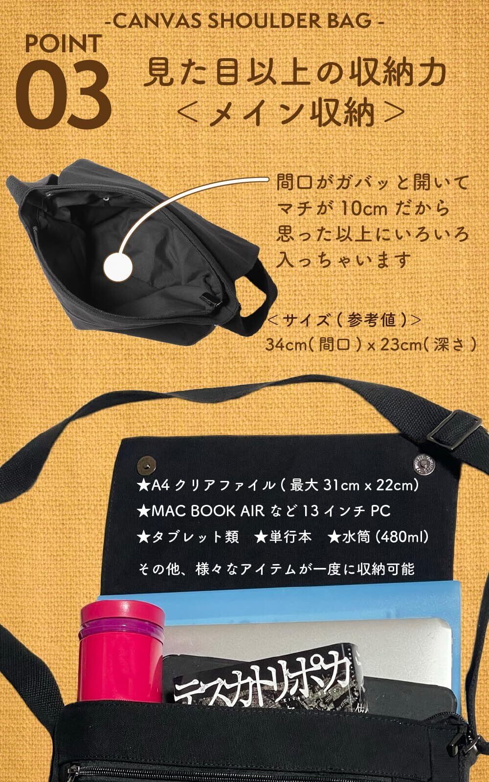 【見た目以上の収納】タブレット・13インチPC・A4書類・500mlペットボトル他、収納可能。(PC用の保護パッドはございません)マチが10cmなので、ラフに色々入るショルダーバッグ。メンズに限らず、女性にも使い易い肩掛けバッグです