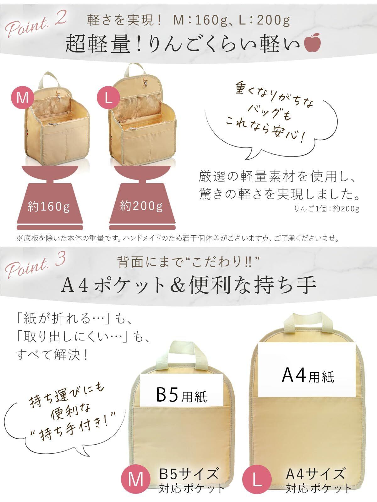 「モダンでシンプルなデザインは、男女問わずどんなスタイルにもマッチします。仕事でもプライベートでも、コンパクトながら存在感のあるバッグインバッグは、プレゼントにも喜ばれること間違いなしです!」