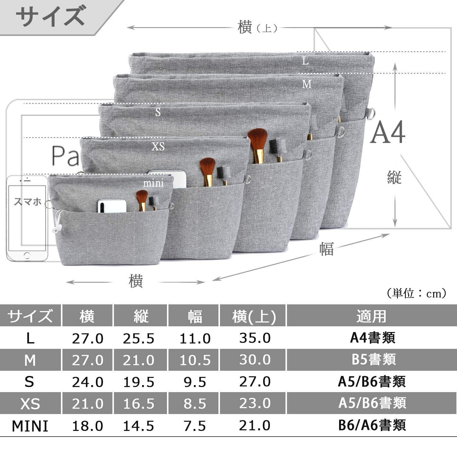 自立/型崩れ防止。自立性がちょうどよい超軽オックスフォード素材(同じ硬度で、重さはフェルト商品の1/2、ナイロンバッグインバッグの1/3)で作られて、様々なカバンに適しています。単独で使うときはしっかり立つことができ、カバンの中に置いた時はバッグのへたる形も安定します。