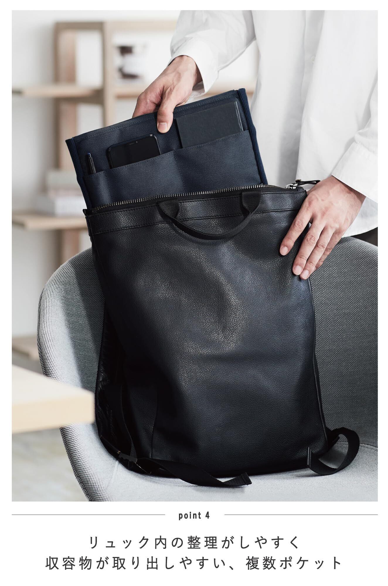 「このバッグインバッグは、A4サイズ対応で、ノートパソコンや書類をしっかり収納可能。内側には多くのポケットがあり、デジタル機器や小物を種類別に整理できるため、取り出しも簡単。また、ファイルや資料がスムーズにしまえるスペースも完備しています。」
