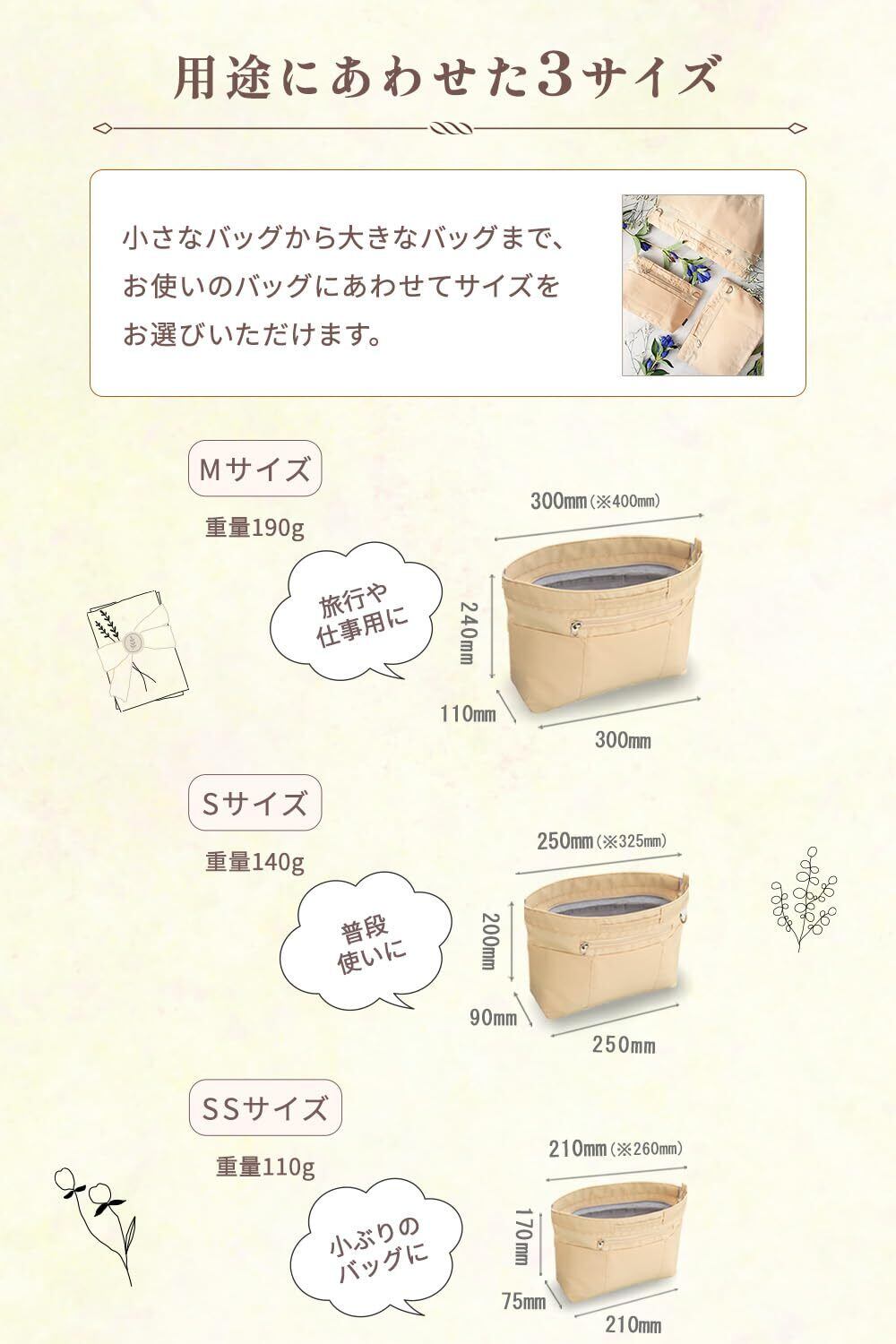 【サイズ・素材】Mサイズ:W300/H240/D110mm(190g) Sサイズ:W250/H200/D90mm(140g) SSサイズ:W210/H170/D75mm(110g) 素材:ポリエステル