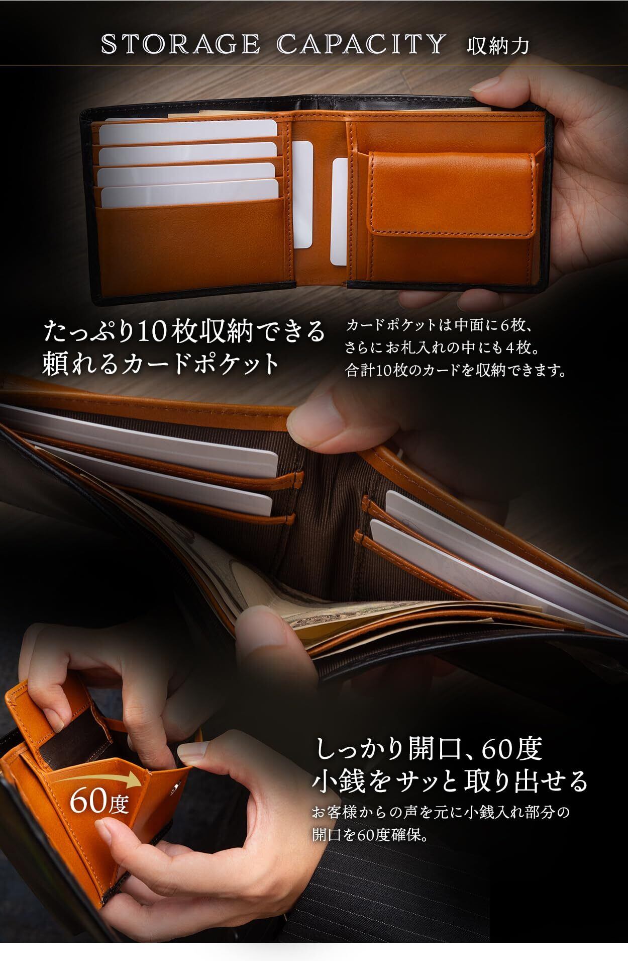 「『アンティークレザー 二つ折り財布』は、職人の手によって丁寧に仕上げられた本革を使用し、独特の風合いと経年変化を楽しむことができる贅沢な素材です。初めて手に取った瞬間から感じる高級感は、使うごとに深まる艶や魅力を引き立て、あなたのスタイルを一層洗練させます。」
