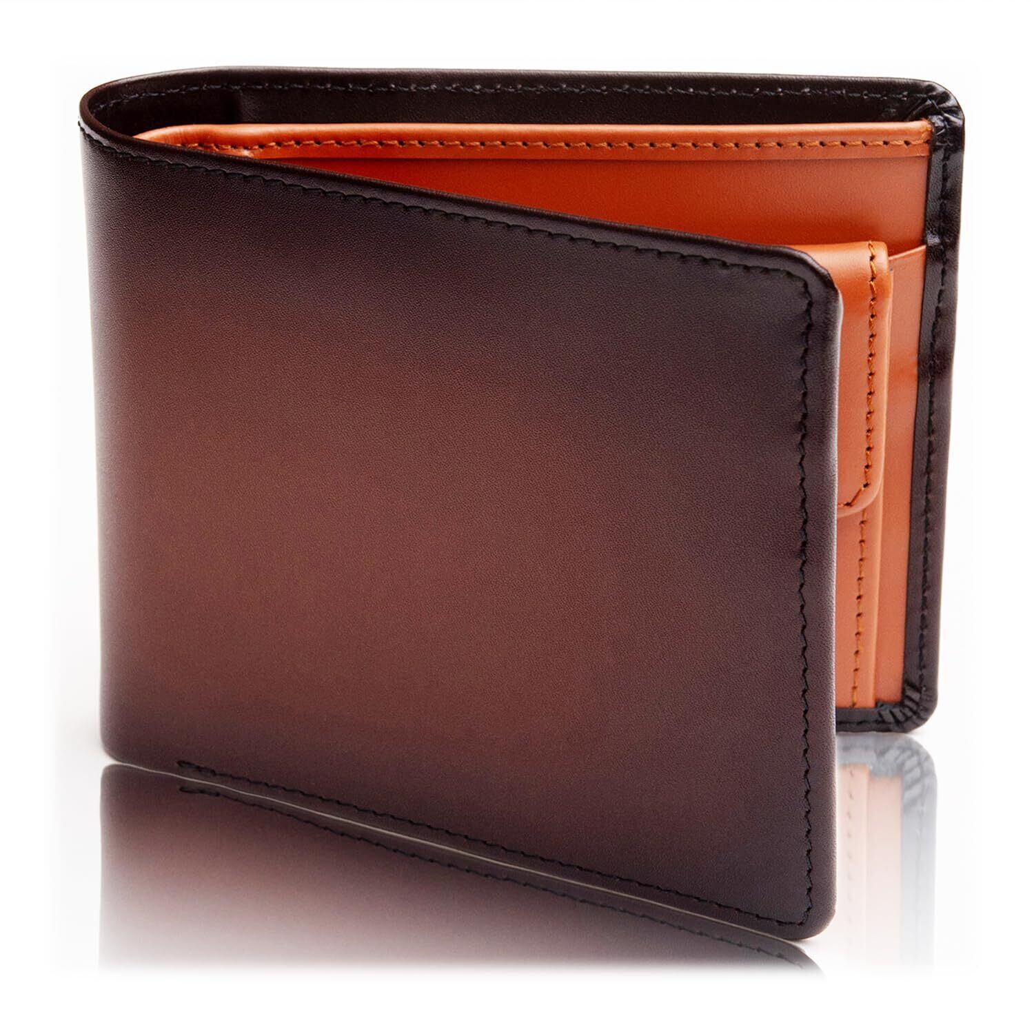 【特徴】 お洒落なツートーンの本革製二つ折り財布(ふたつおり財布)/【収納力】 小銭入れ[1区画]、お札入れ[2区画]、カードポケット[10カ所](うち4カ所はお札入れの中の隠しポケット)