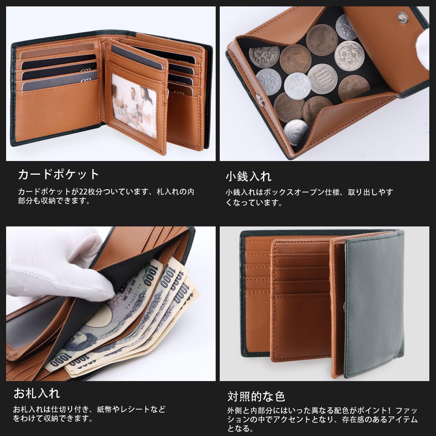 - 特徴:22枚収納可能なカードポケット、ボックス型小銭入れ