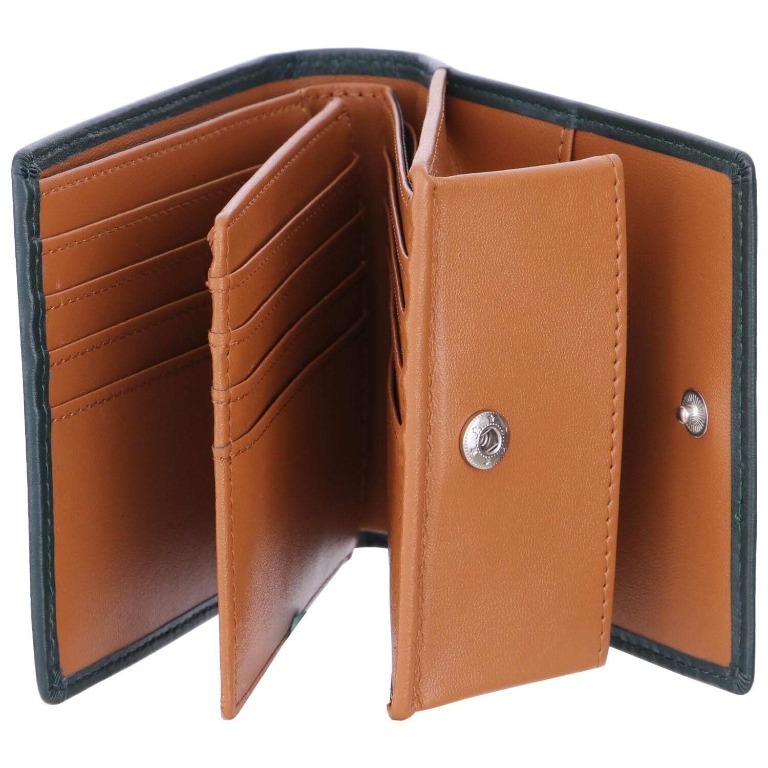 「『GSG 二つ折り財布』は、厳選された本革を使用しており、その美しいグリーンとブラウンのコンビネーションが一際目を引きます。使い込むほどに深みを増す本革の風合いは、時が経つにつれて愛着が湧いてくること間違いなしです。ビジネスやカジュアルなシーン両方で、洗練された印象を与えるアイテムです。」
