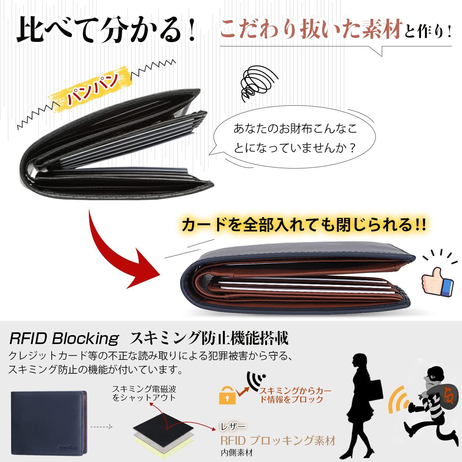 【スキミング防止機能搭載】今話題になっているのがカードの情報を守るスキミング防止のできるアイテム。様々な手口の犯罪が増えてきている昨今でおさえておきたい機能です。このメンズ財布はブロック防止フィルムを生地全体に搭載しているため、磁気をブロックし、個人情報などを抜かれる「スキミング」被害を防止できて、しっかり守ってくれます。