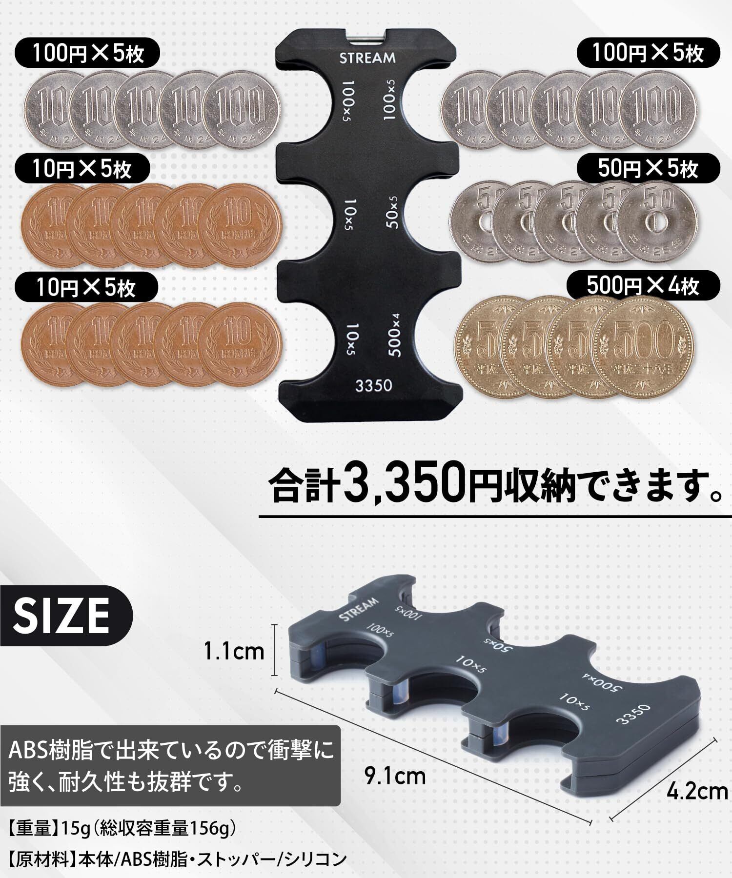 【収納力が大幅アップ】500円×4枚・100円×10枚・50円×5枚・10円×10枚(合計3,350円)が収納できます。
