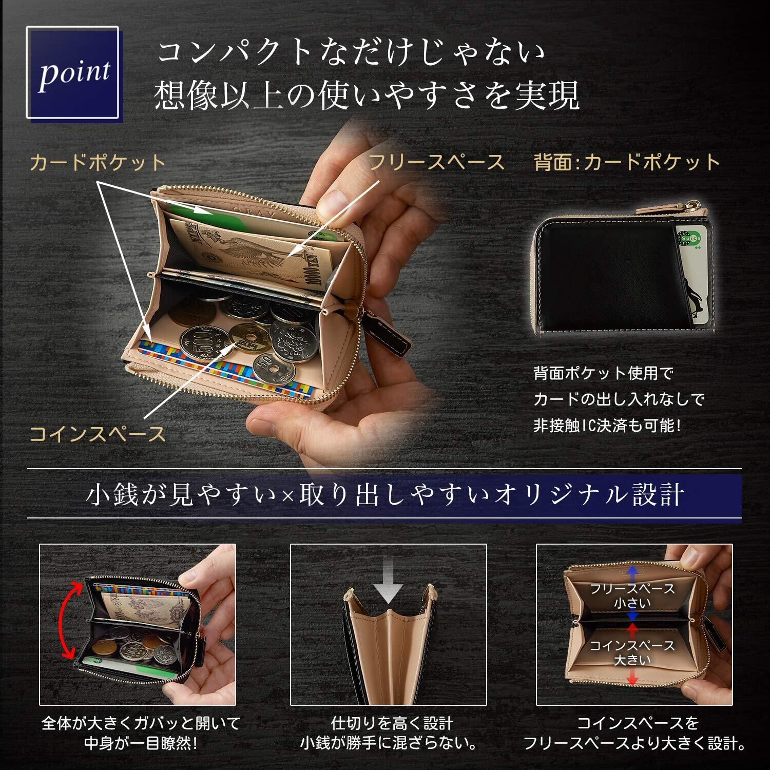 【 コンパクトでも想像以上の使いやすさで 日常がスマートに 】コンパクトボディに機能性豊かな5つのポケットを装備。ただコンパクトなだけじゃない 使いやすさにもとことん拘りました。内側にはコインスペースにフリースペースとカードポケットが2つ。また背面にはICカード使用に便利な背面カードポケットも装備。内部のスペースはコインスペースがフリースペースより少し大きくなっていることで収納している小銭の視認性をアップしているとともに、収納するものの使い分けがさらに便利に。