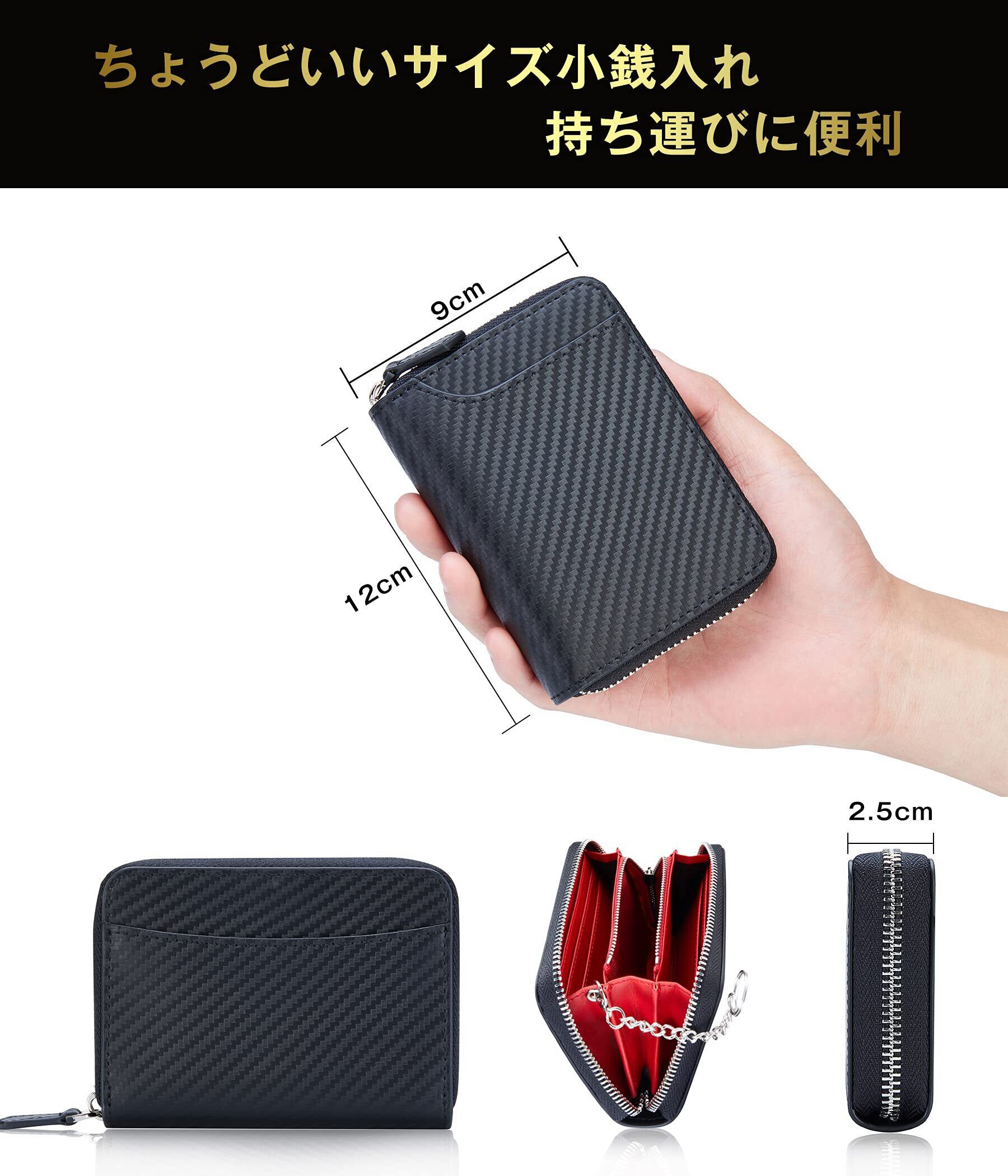 小銭入れ メンズ 本革 コインケース ミニ財布 8カード入れ キーリング付き 小さい 財布 コンパクト カーボンレザー (カーボンブラック×レッド)