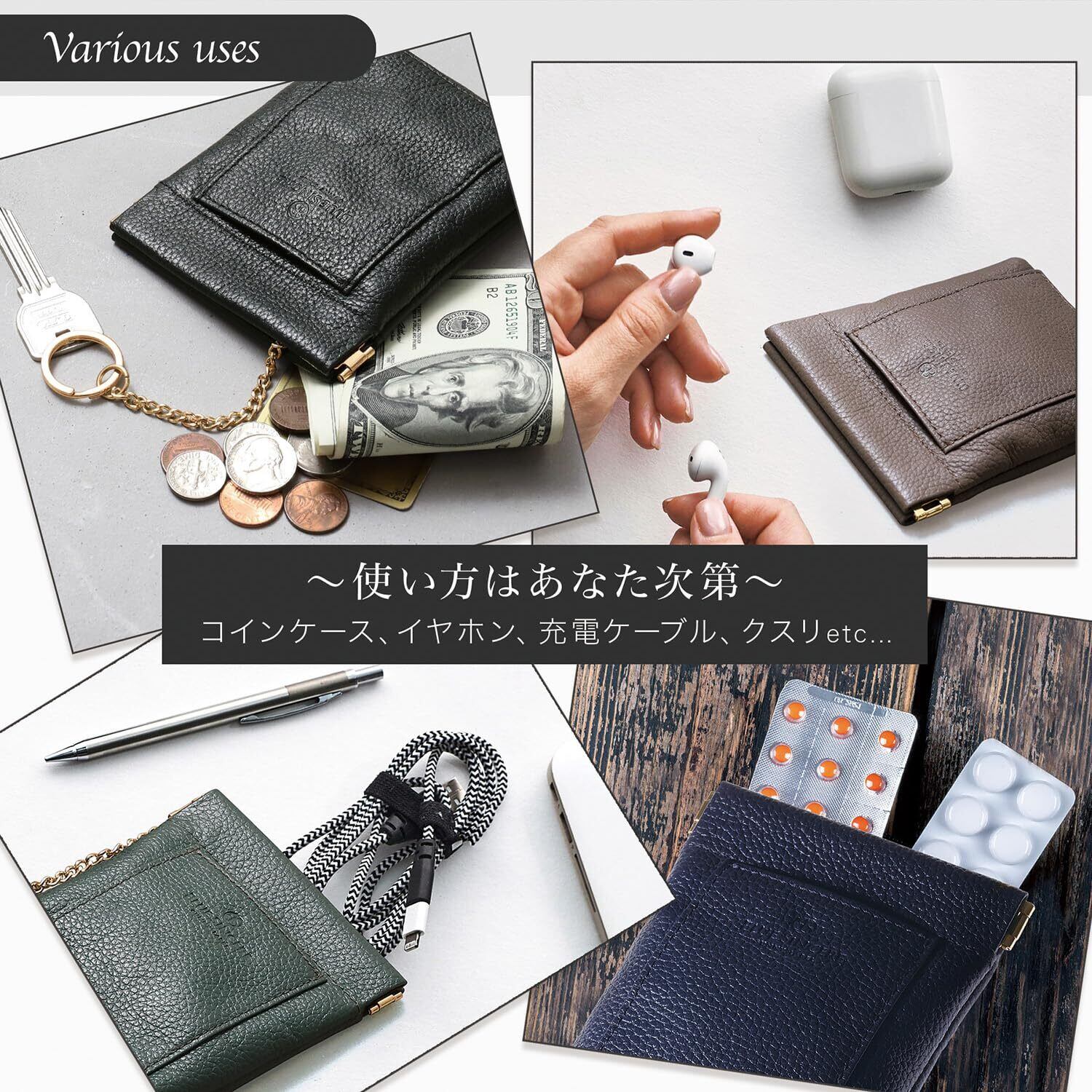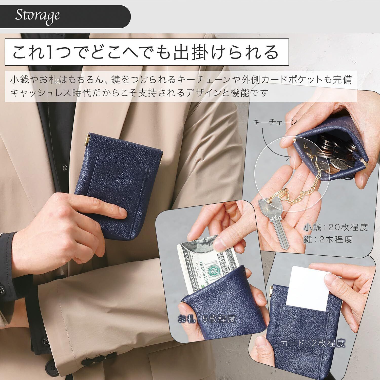 - 特徴:クレジットカード、お札、小銭、鍵を収納可能、片手での開閉設計