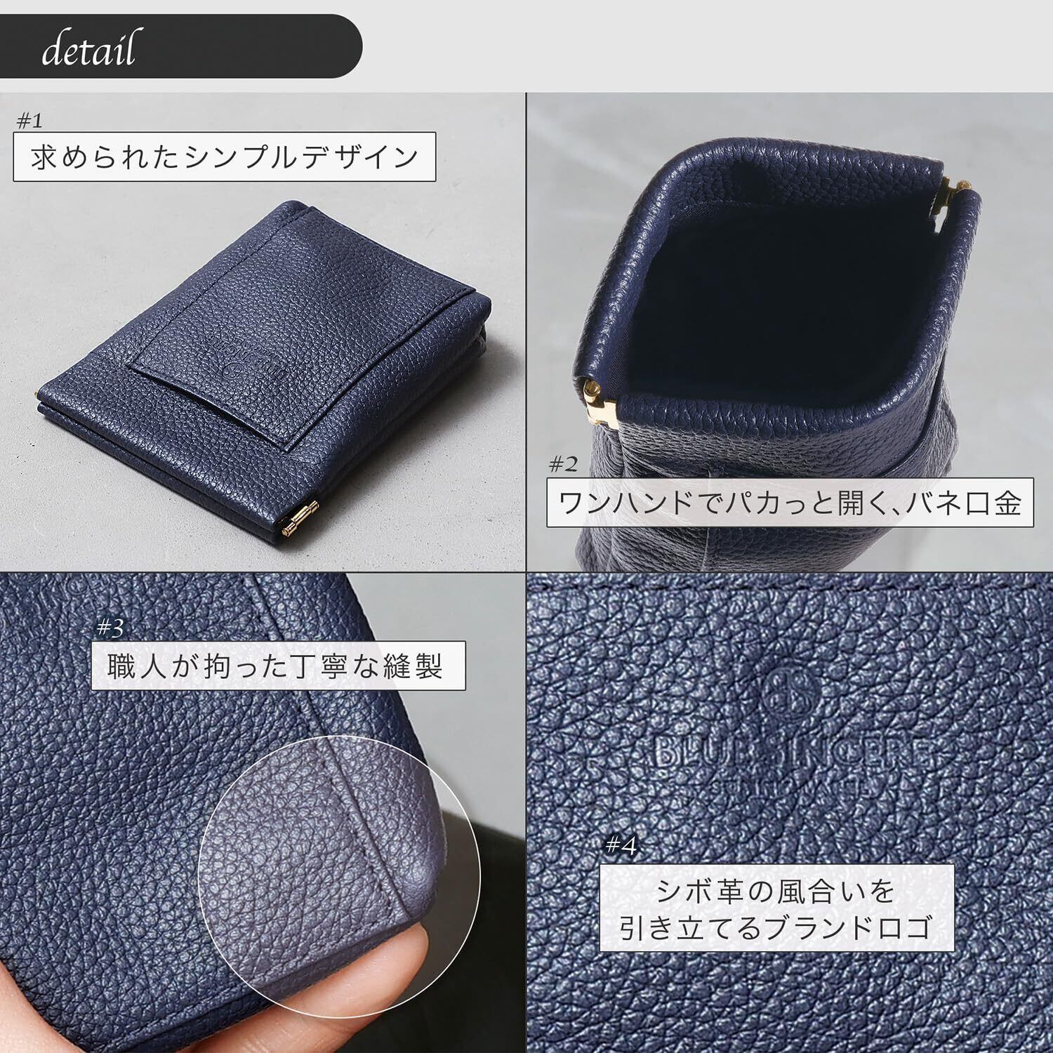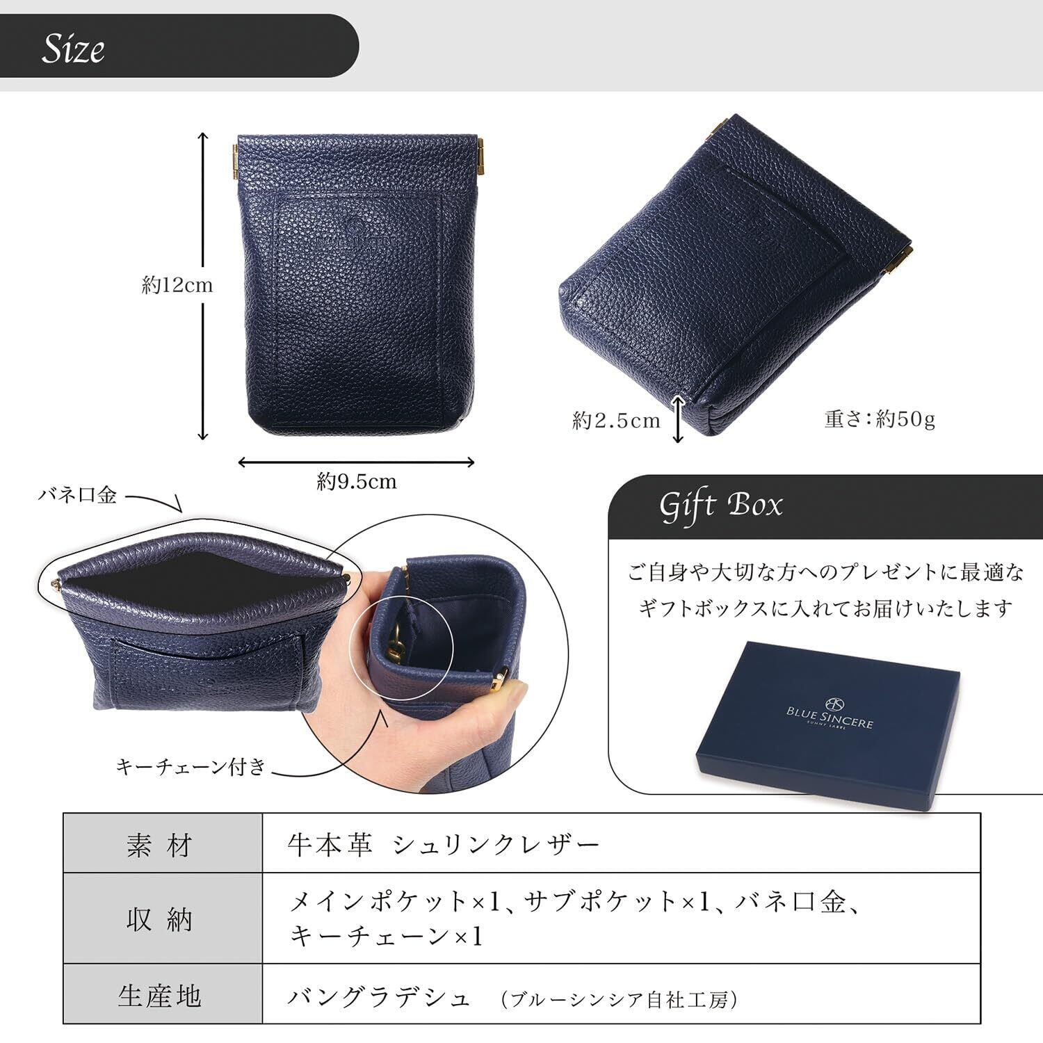 【 ブルーシンシアとは? 】 「ブランドの発展とともに、バングラデシュの社会問題を解決する」という理念を掲げ、 バッグや財布を自社工場のバングラデシュの職人たちと、その土地の素材の可能性を追求し、 先進国でも通用する高機能なプロダクトを生産しています。 【こだわりの素材と機能性】厳選された上質なシュリンクレザーを使用し、しっとりと手に馴染む質感と高級感ある艶やかな風合いを実現しました。見た目の美しさだけでなく、使い込むほど手に馴染む本革ならではの魅力をお楽しみいただけます。シンプルなデザインと計算し尽くされたサイズ感だからこそ、ミニマルなサイズ感なのに、たっぷり入る!小銭だけではなく、お札やクレジットカード、鍵などもしっかりと収納可能。無駄な仕切りがないからこそ、パッと開けてスマートに使用可能です。日常使いはもちろん、ビジネスシーンでもスマートに活躍する、機能性とデザイン性を兼ね備えたアイテムです。