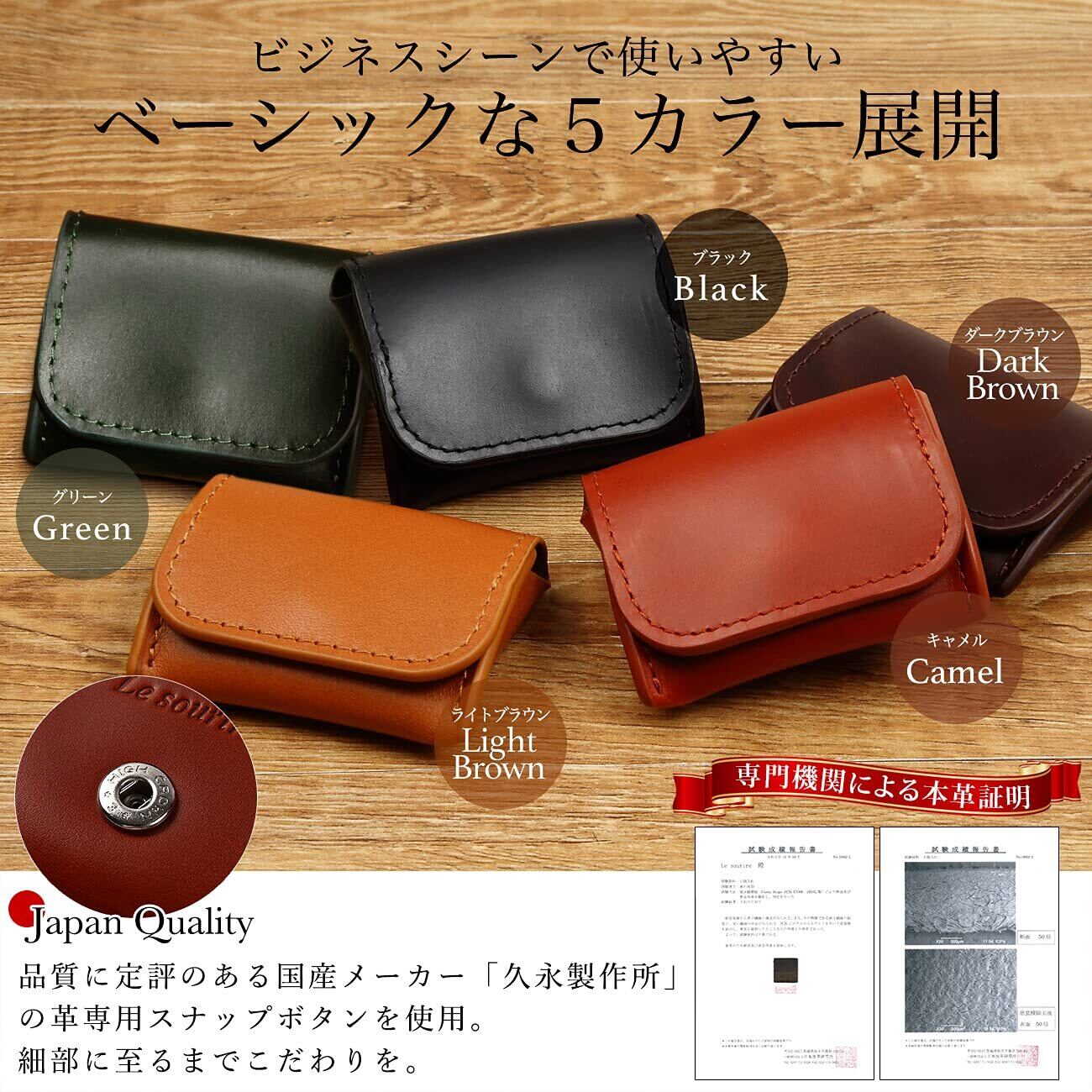 【サイズ】:縦50mm x 横60mm x 厚み17mm 約14g 【素材】本革オイルレザー(本革証明)、スナップボタン:国産メーカー「久永製作所」製 【カラー】ブラック・ダークブラウン・キャメル・ライトブラウン・グリーン 【その他】プレゼントにも最適なギフトパッケージ入り、意匠権中