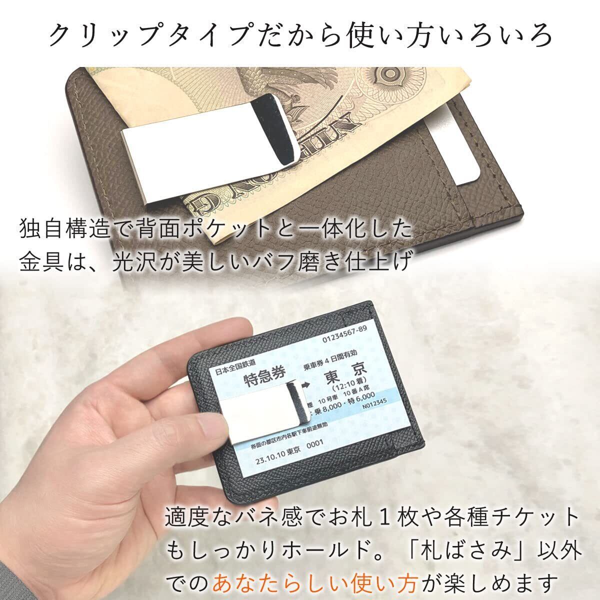 トップブランド御用達の高級レザー「ヴォーエプソン(ヴォー・エプソン)」を使用した表はカードケース、裏はマネークリップの本革製品です。カラーバリエーションはエトゥープ(グレー) ・ブラック ・ゴールド(ブラウン)の計3色をご用意いたしました。レザーは、フランス産ハイブランドレザー・ヴォーエプソン使用でご用意。この商品は、職人が丹精込めて仕上げました。広めに設計されたポケットはカードを出し入れしやすく、その所作をスマートに演出。 前面ポケットには曲線を取り入れ優美な印象に仕上げました。