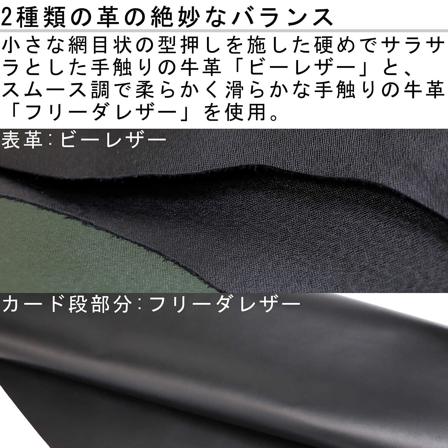 表の革には小さな網目状の型押しを施した牛革「ビーレザー」を使用。硬めでサラサラとした手触りの牛革です。カード段のある内装には柔らかく滑らかな手触りの牛革「フリーダレザー」を使用。