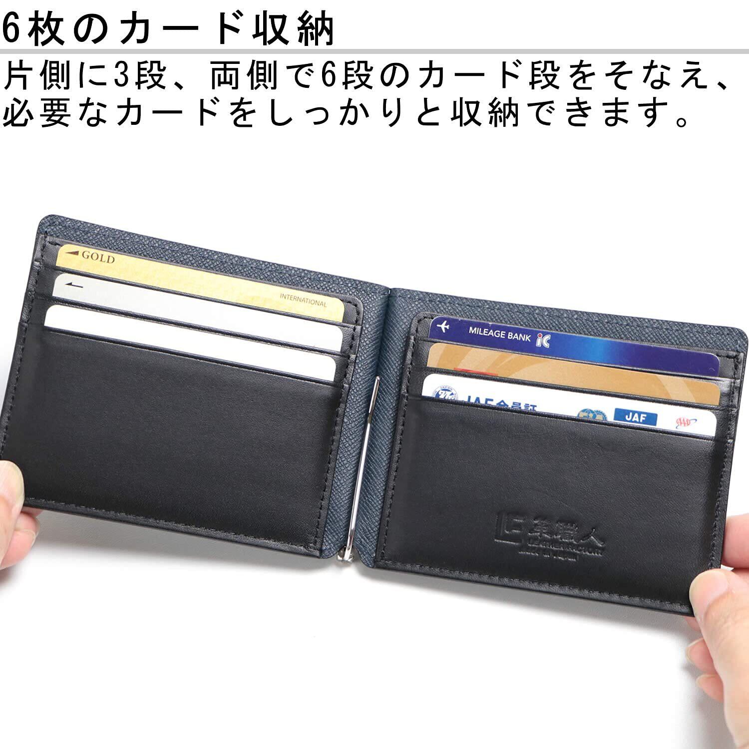 [種別] 札ばさみ マネークリップ メンズ 財布 [サイズ(約)] 横11.2cm 縦8.5cm 厚さ1cm [素材] メイン:牛革、裏地:シャンタン生地 [重さ(約)] 65g [機能] 札ばさみ×1、カード段×6、そでポケット×2 [生産] 日本製