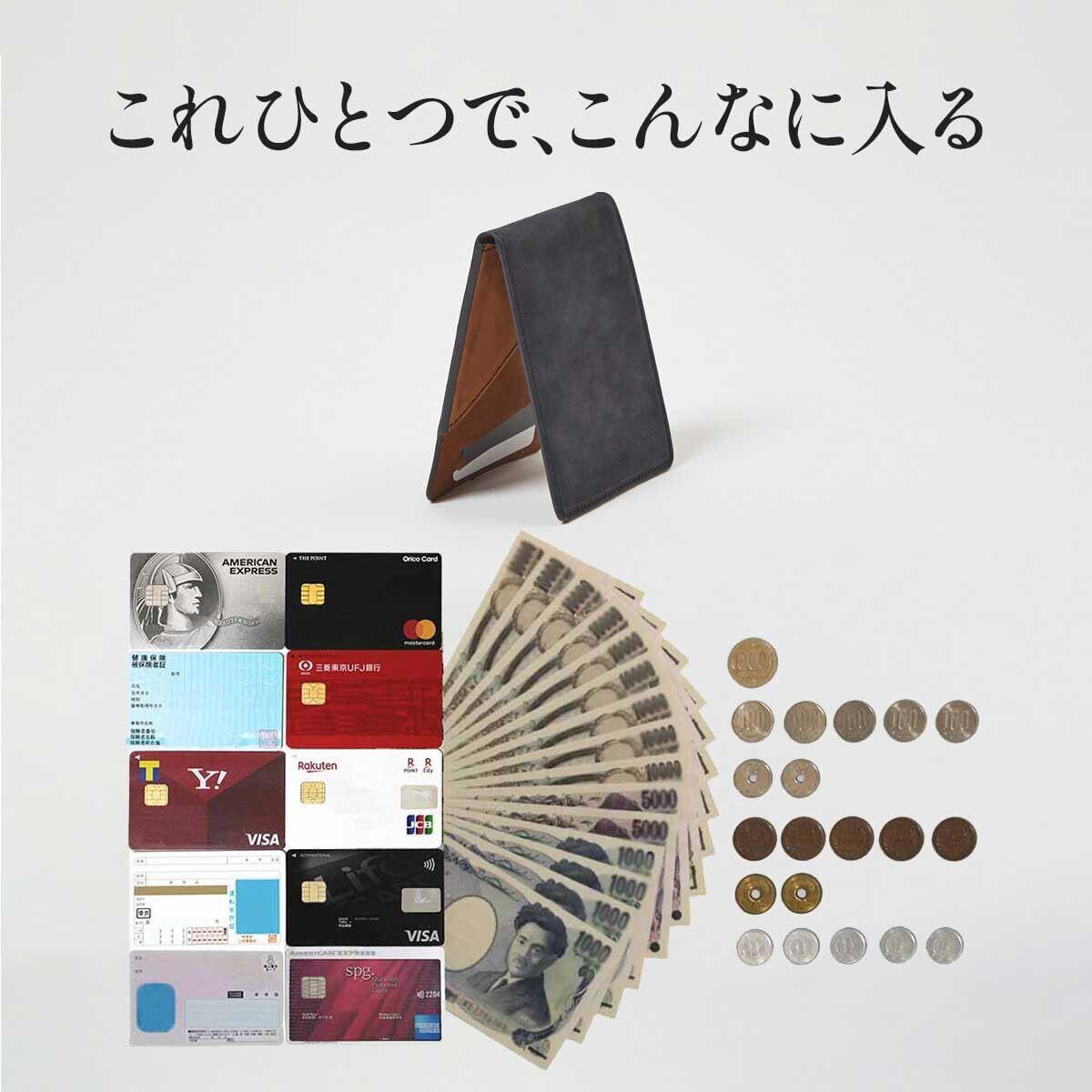 - 特徴:マネークリップ、小銭入れ付き、薄型二つ折り財布
