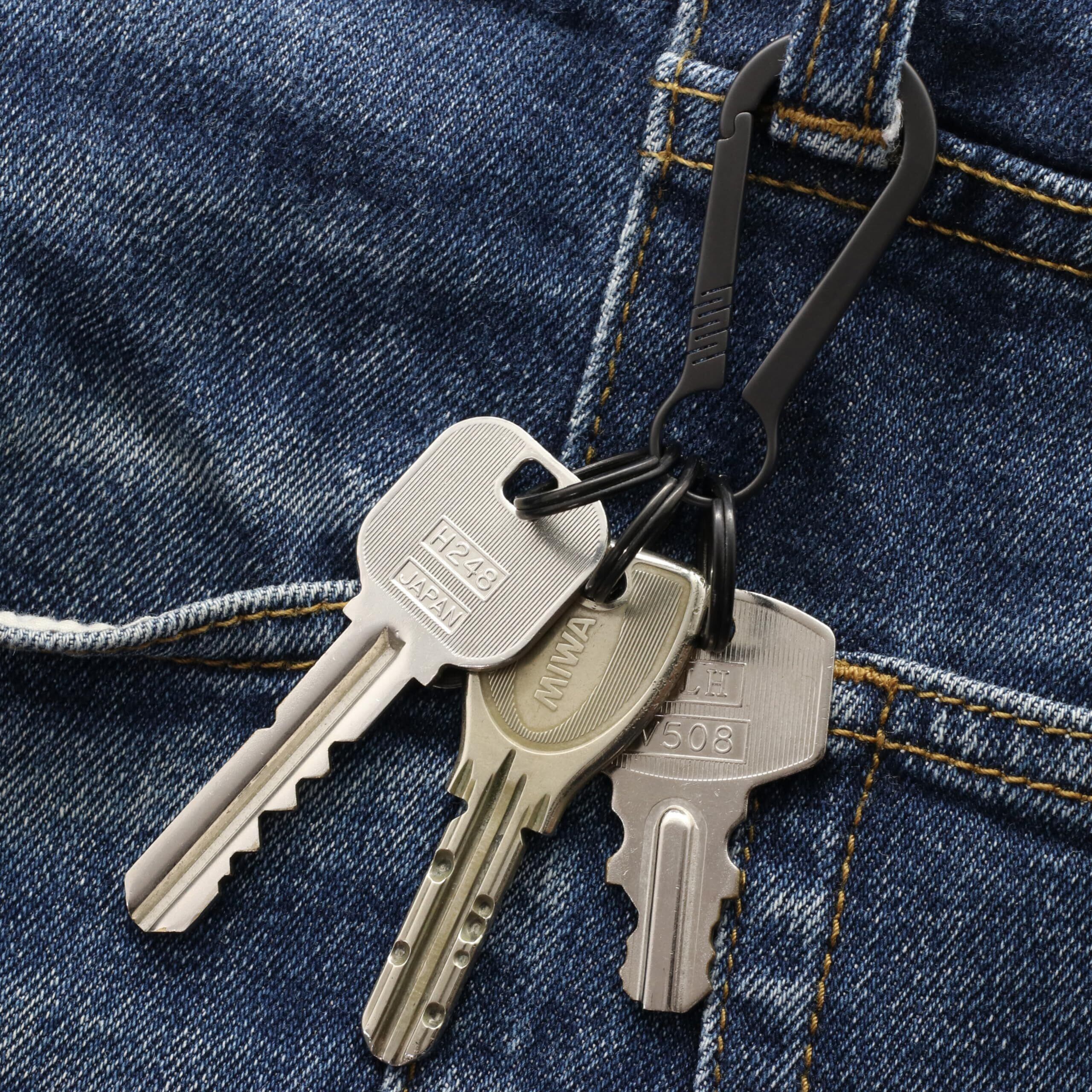 【ベルトループやキーリングにワンタッチで取り付け】ベルトループやキーフックにぶら下げやすいカラビナ形状で、リングの取り付け取り外しもワンタッチで可能です。