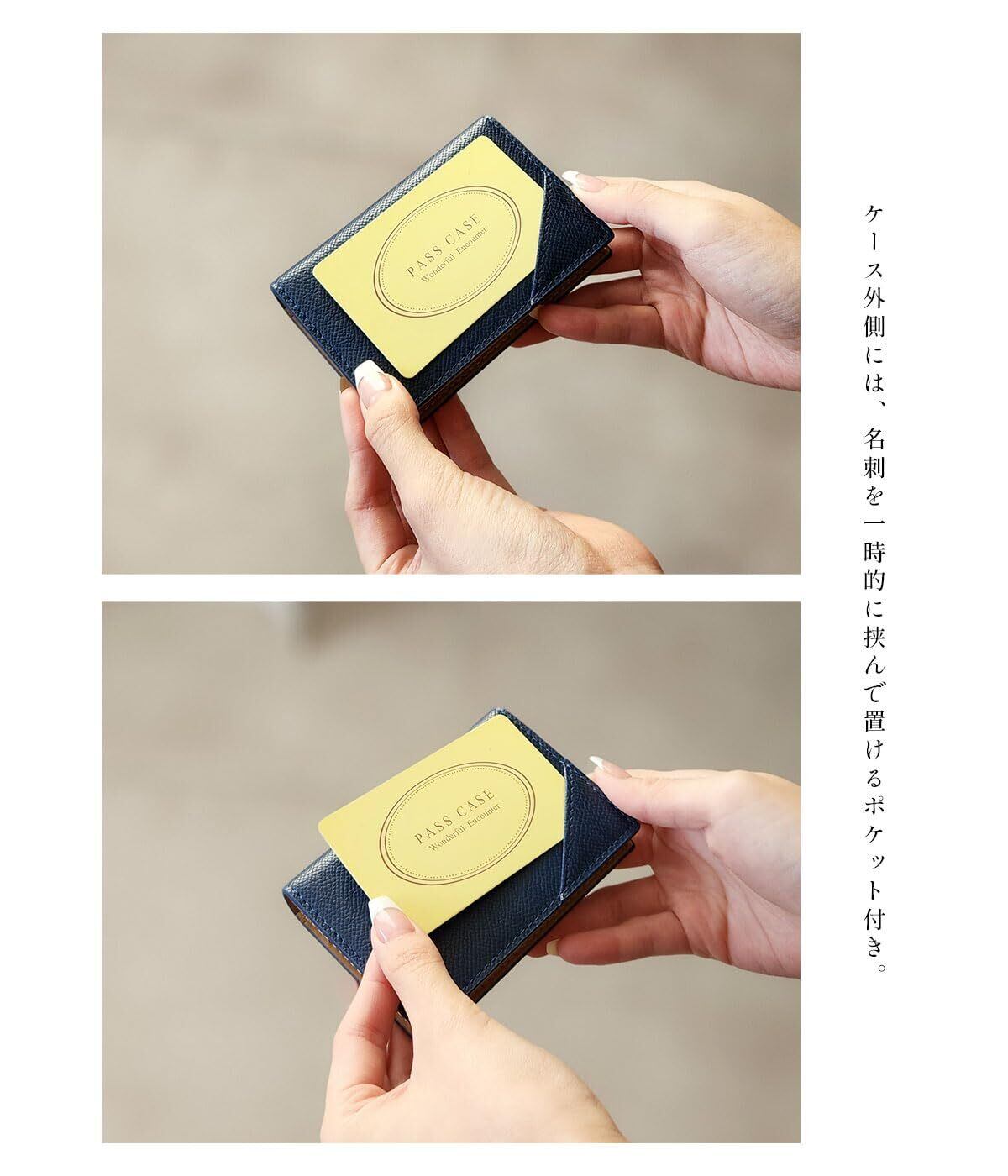 「この名刺入れは、最大で20枚以上の名刺やカードをしっかり収納できる設計です。いつでも必要なカードをスムーズに取り出せるので、会議やビジネス交流の場でも安心です。効率的なカード管理を実現し、常にスッキリとしたバッグの中を保ちます。」