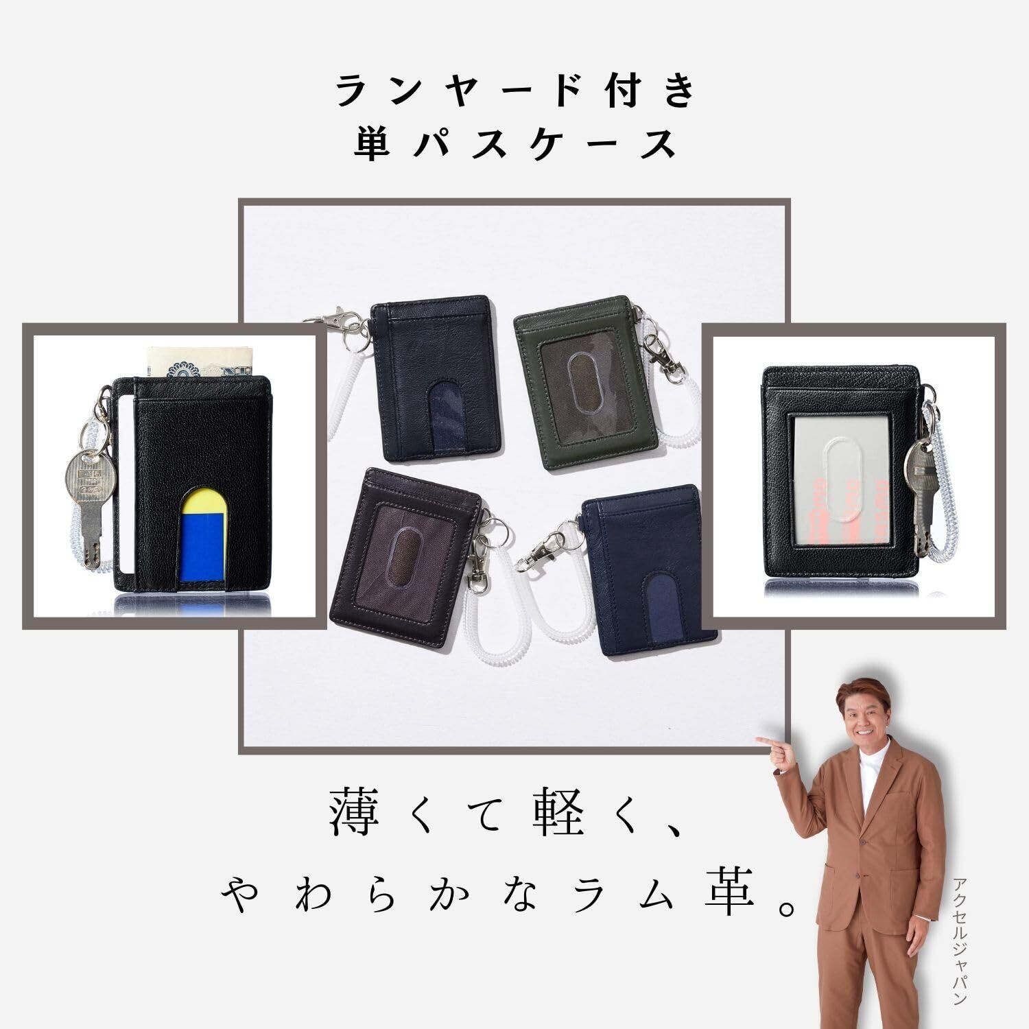 - 特徴:軽量・薄型、定期券入れ、ランヤード付き