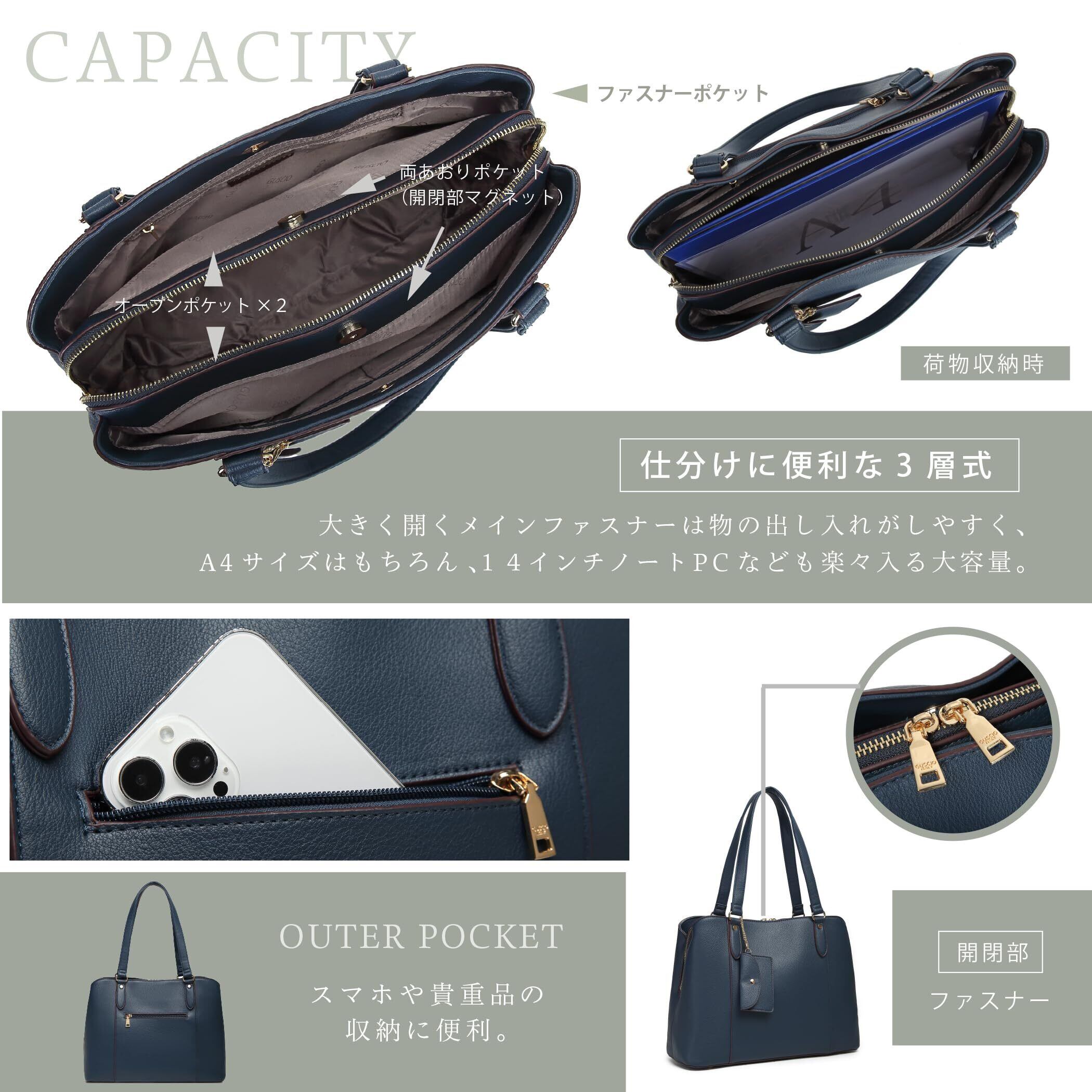 「このトートバッグは、通勤やリクルート活動時に自信を持って使用できるアイテム。ビジネススタイルを引き立てる洗練されたデザインが、毎日のファッションをサポートします。」