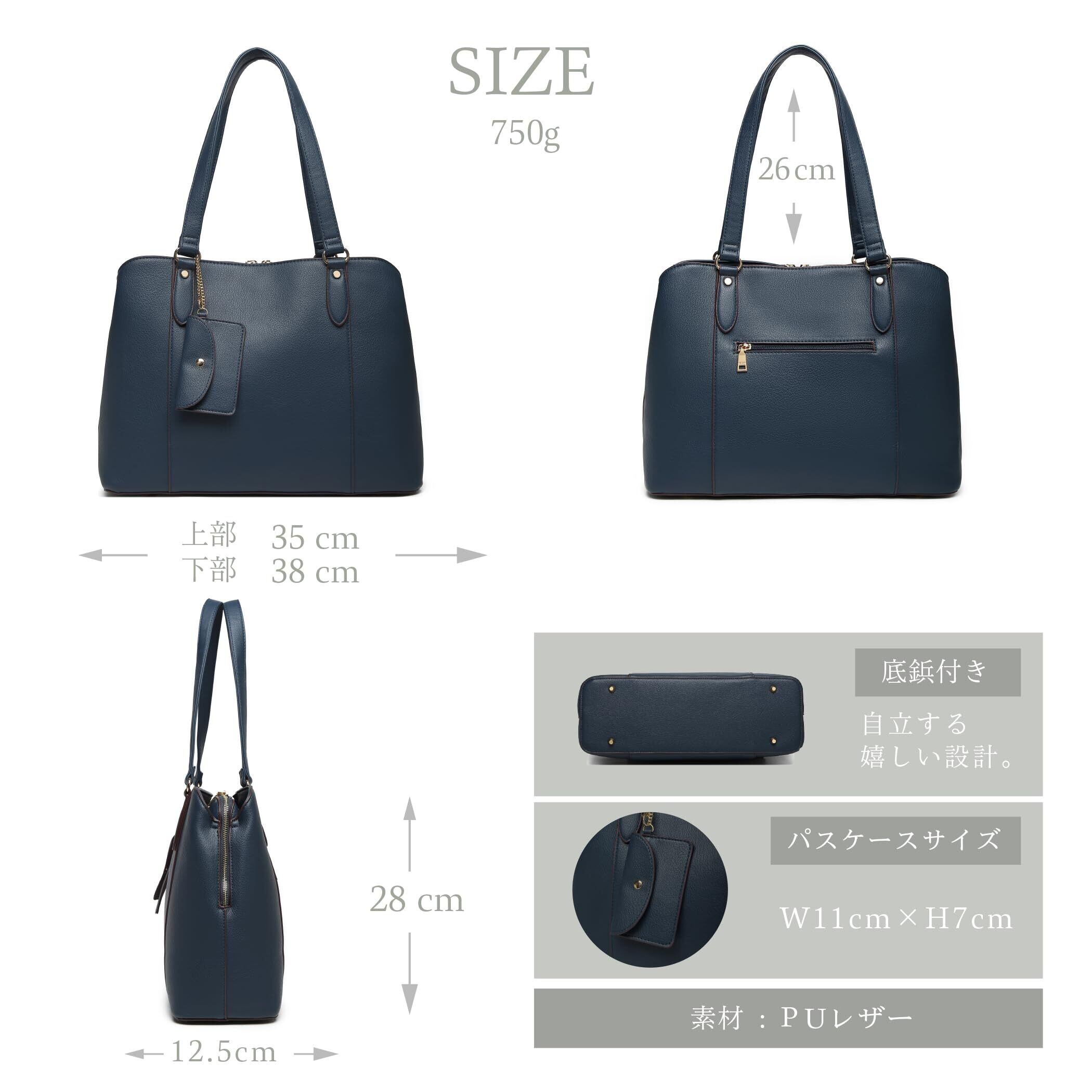 幅: 上部約35cm 下部約38cm 、 高さ(中央部):約28cm、マチ:約12.5cm、 ハンドル:長さ58cm 高さ 26cm 重量:750g 付属カードケース:W11cm×H7cm、【開閉部】ファスナー、 【内側ポケット】両あおりポケット(開閉部マグネット)、ファスナーポケット、オープンポケット×2 【外側ポケット】ファスナーポケット 【素材】PUレザー