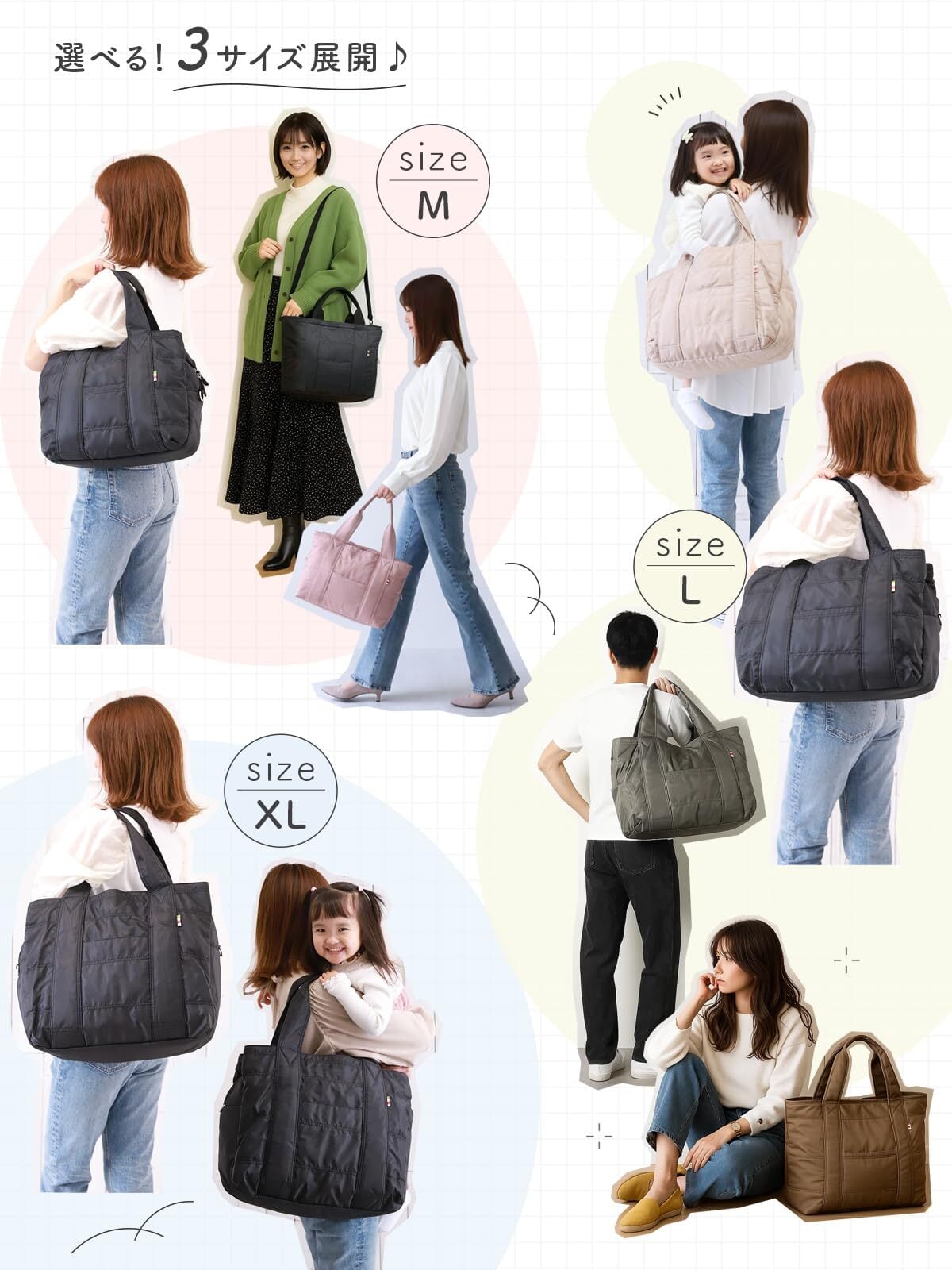 【2WAY仕様でシーンに合わせて使い分け】 ショルダーベルト付きで肩掛け・斜め掛けも可能。両手が空くのでお子さま連れのお出かけにもぴったりです。Mサイズは日常使いに、Lサイズは荷物が多めの方におすすめ。シーンやライフスタイルに合わせて選べます。