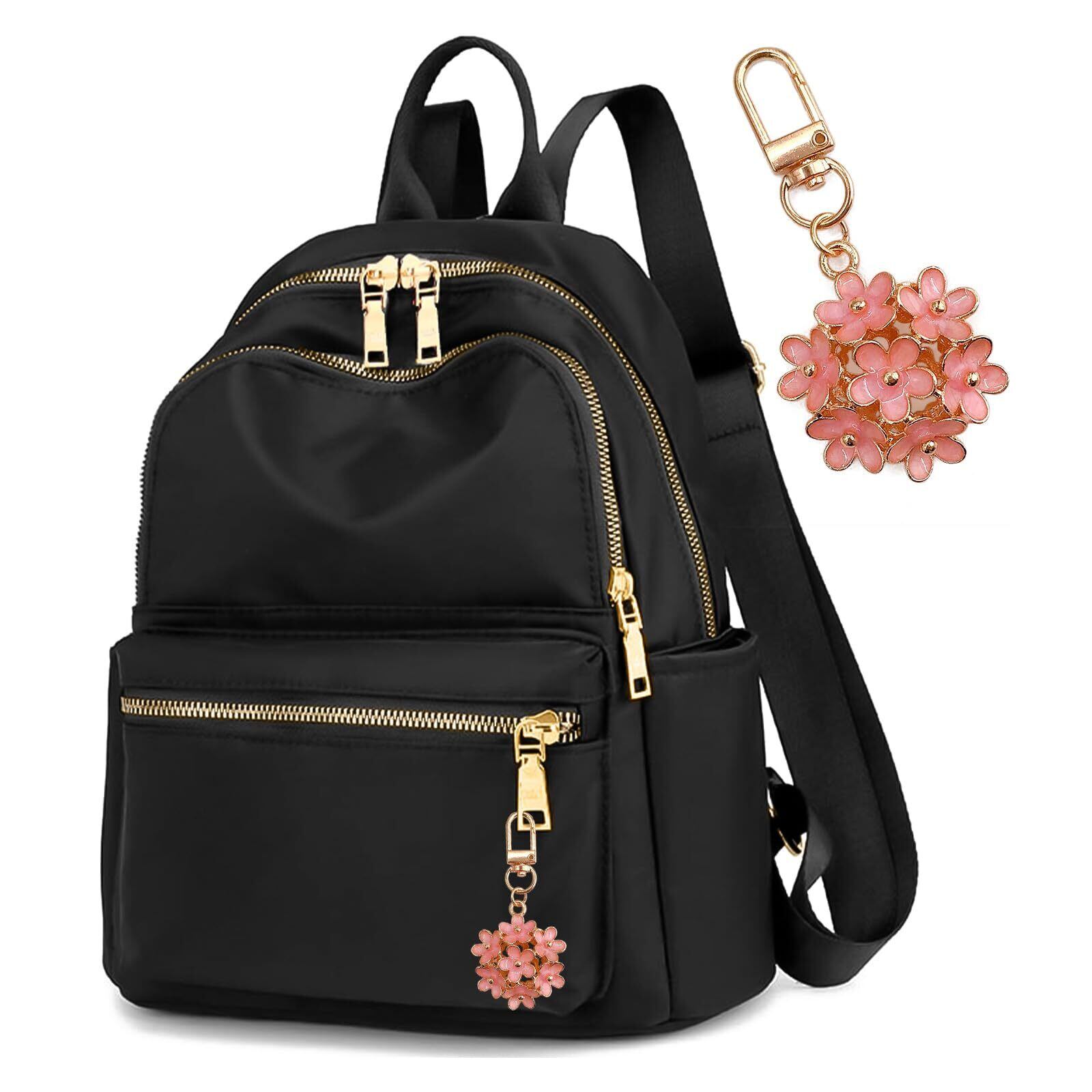 【おしゃれで機能性抜群のレディースリュック】シンプルデザインのリュックに、可愛いフラワーキーホルダーのアクセントが上品なレディースリュックサックです。高品質ナイロン素材採用で、耐久性があり丈夫で、撥水仕様のため日常の雨をしっかり防ぐことができます。また軽量なので一日背負っても疲れません。ゴールドの金具がアクセントとなったエレガントなバックパックです。カジュアルからきれいめまで幅広く活用でき、通勤・通学にもぴったりです。(フラワーキーホルダーはフロントポケットまたは背面ポケットに入っています)