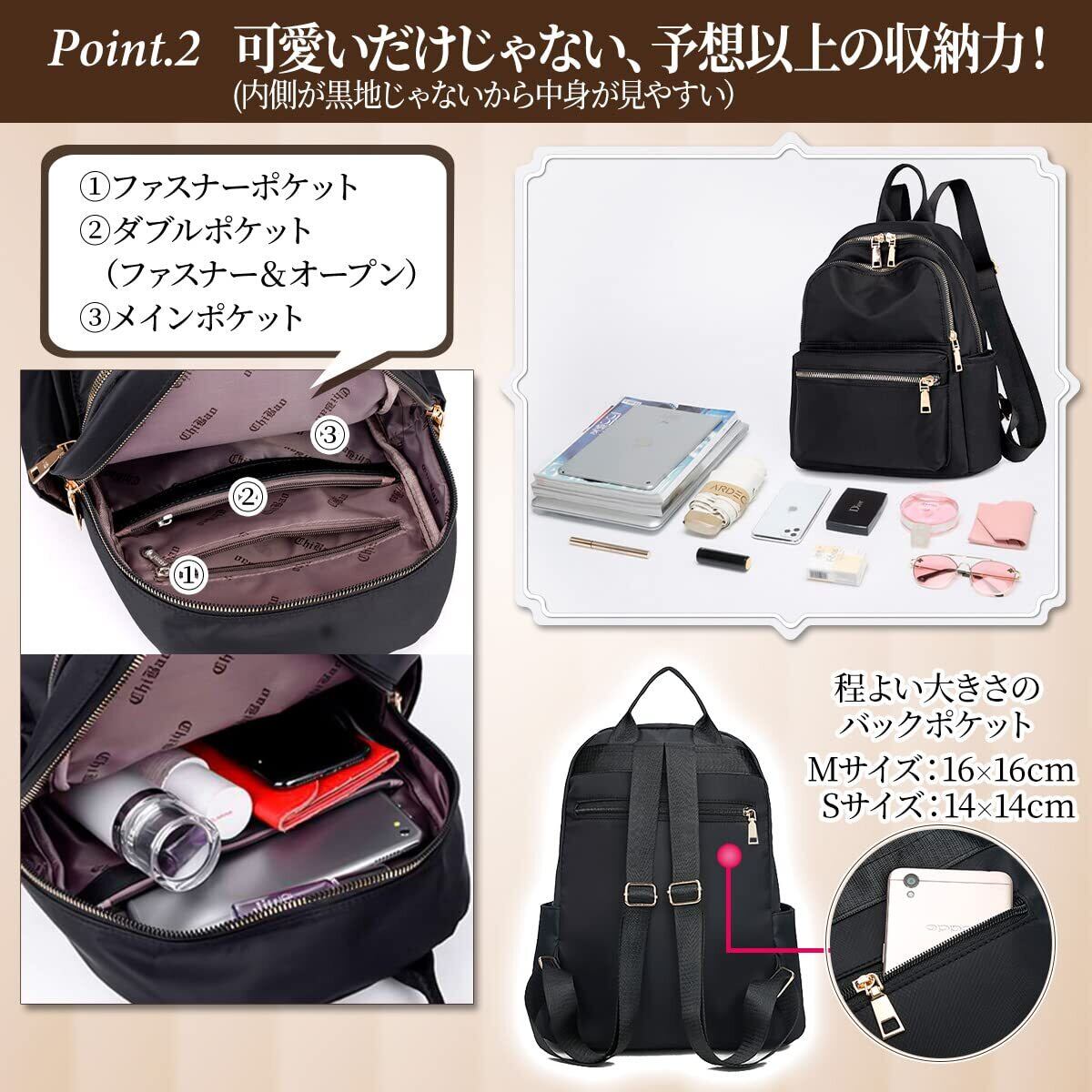 【見た目以上の便利な収納力】ポケットが多いから収納力がたっぷり(S/Lサイズは9ポケット、Mサイズは11ポケット)。メインポケットと小物用ポケットがバランスよく配置されているから、iPAD、折畳み傘、財布、化粧品、鍵などの小さなアイテムもしっかり整理整頓することができます。リュックの内側が黒地ではないので、中身が見やすく取出しやすいのもポイントです。スマホや貴重品を入れるのにおススメの背面ポケットはほどよい大きさで便利です。毎日持ち歩くバッグとして、旅行用のバッグとして幅広く機能的にご使用いただけます。