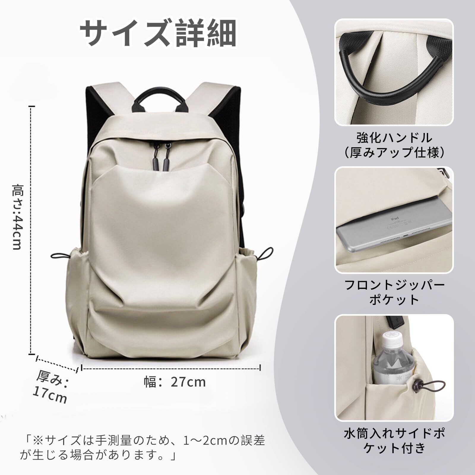 「このリュックは、14インチのノートパソコンをしっかり収納できる大容量設計となっています。また、複数のポケットを備えているため、小物や書類を整理しやすく、全体がスッキリとまとまります。日常の必需品やレジャー用の荷物も、しっかりと収納できます。」
