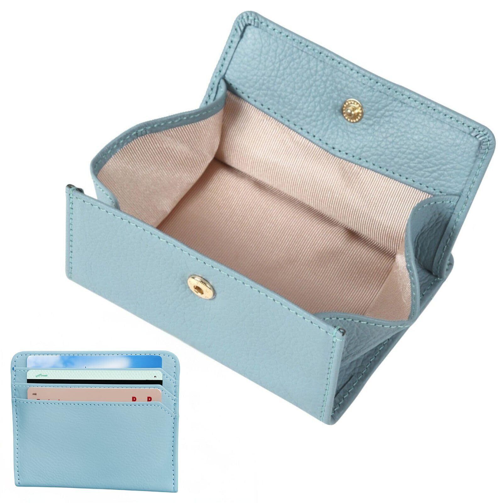 【W監修 レザーソムリエ×カラーコーディネーター】 小銭入れ コインケース レディース カード入れ付き【女性の為のキャッシュレスBOX型小銭入れ 外側カード3枚 フリーポケット付】コンパクト 薄型 マルチ ミニマリスト (ライトブルー)