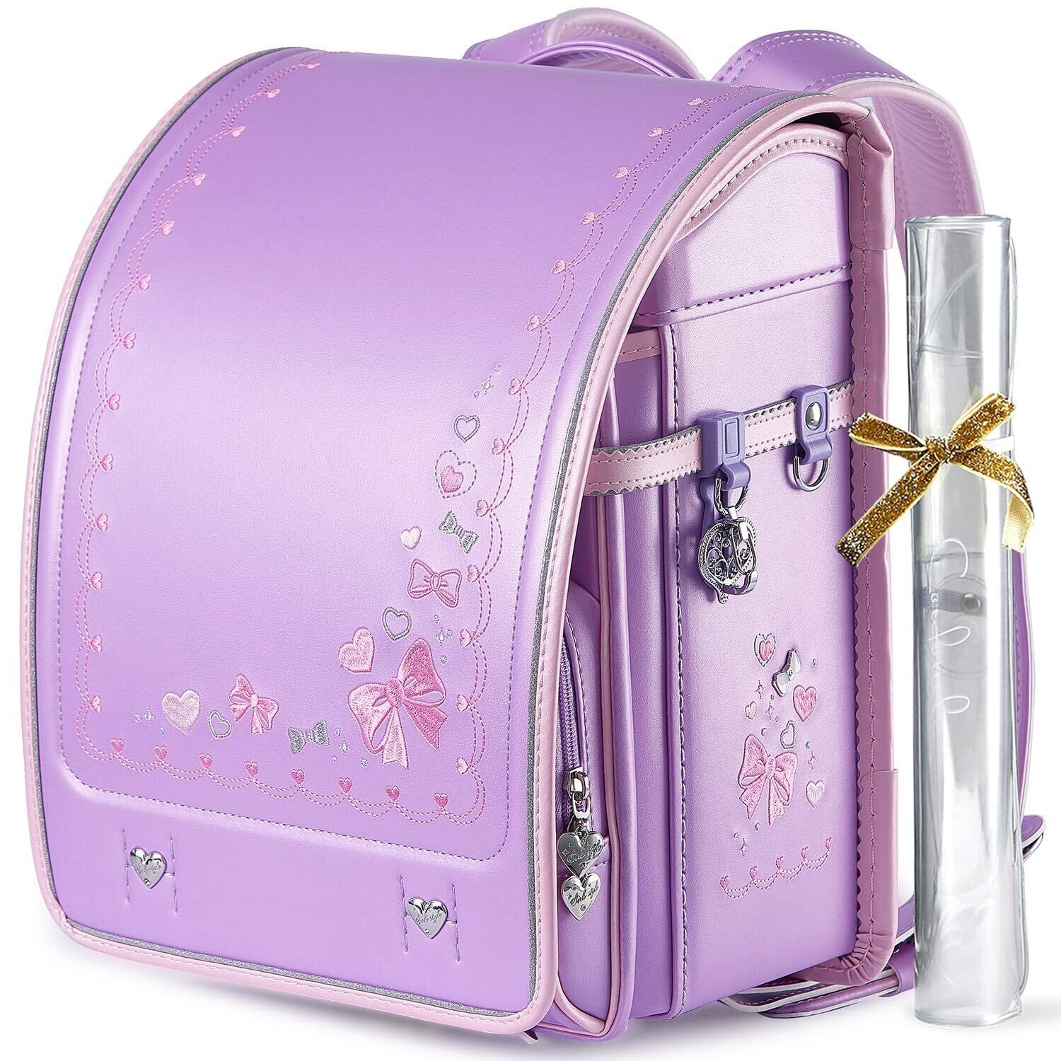 - 特徴:ワンタッチロック、ハート&蝶結び刺繍、透明ランドセルカバー、シューズ袋付き