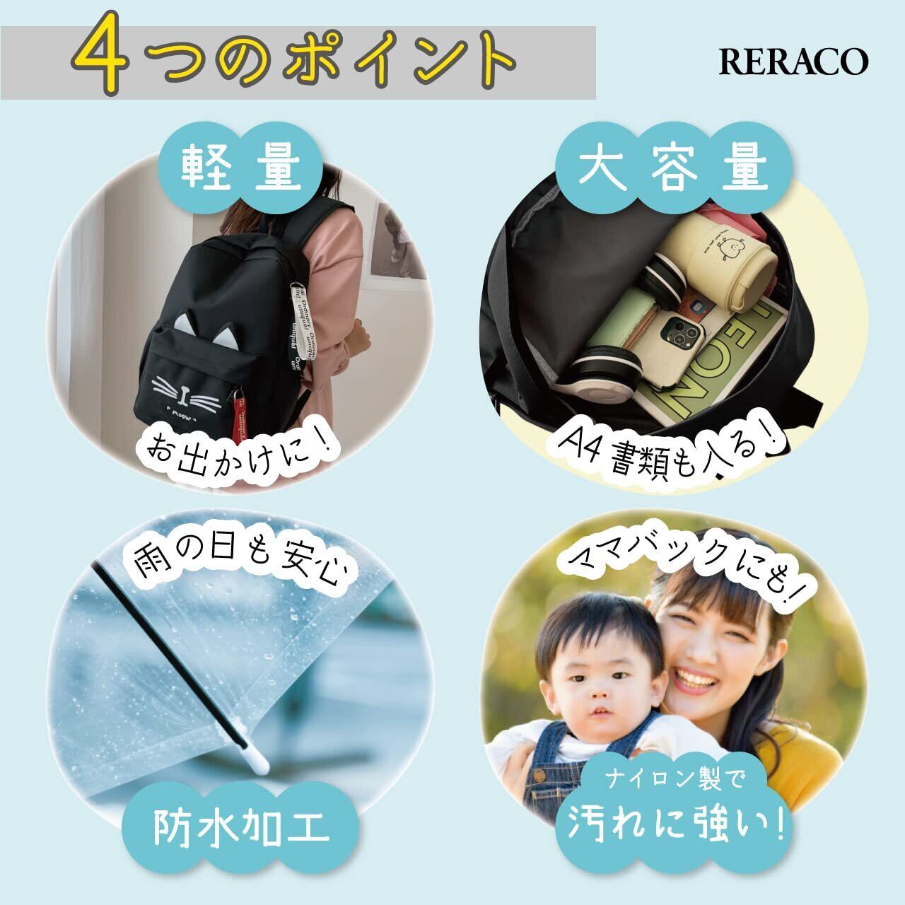 「この[RERACO] リュックは、黒猫の耳がついたキュートなデザインが魅力です。猫好きなお子様や女子にぴったりで、通学やお出かけが楽しみになること間違いなし!毎日のおしゃれに華を添えます。」